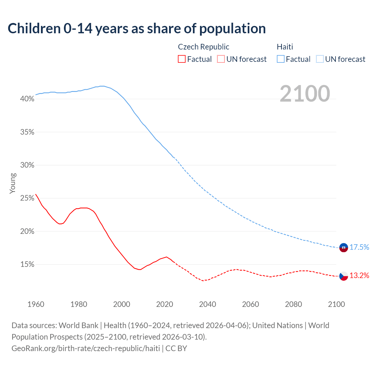 According to the latest available data on birth rates, the fertility rate in the Czech Republic was 1.45 children per woman in 2023, compared to 2.66 in Haiti in 2023. The replacement level is considered to be 2.1 children per woman.
