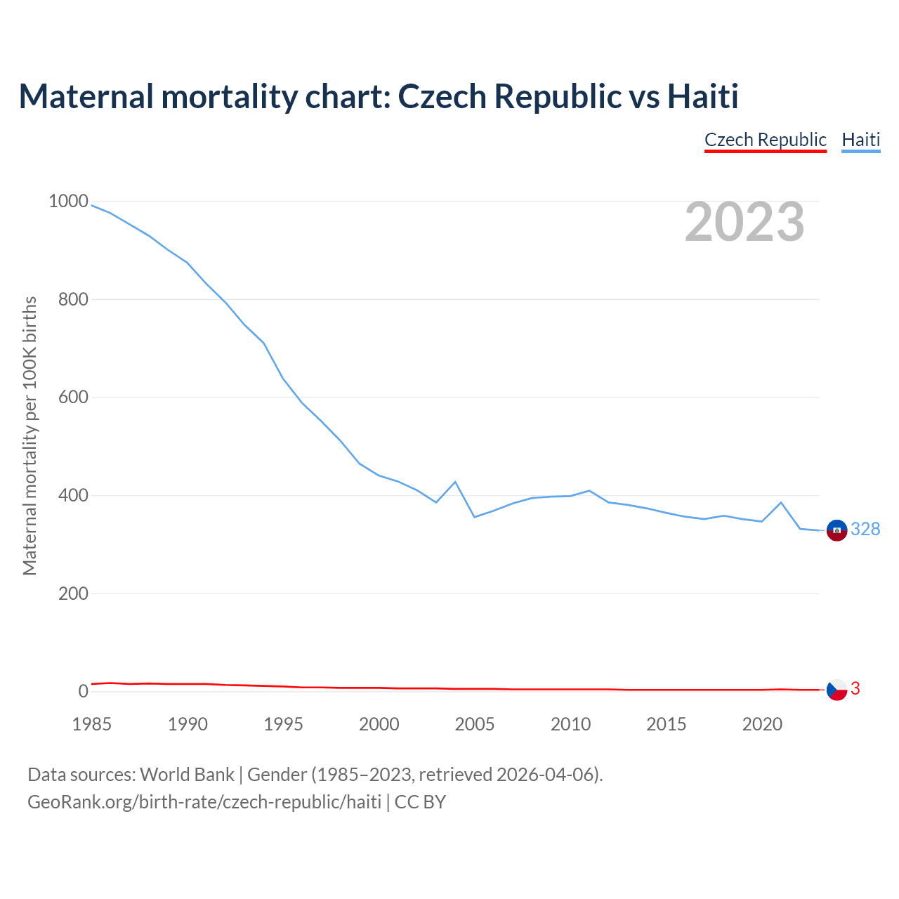 The maternal mortality rate, which is the probability of dying during childbirth or within 42 days of pregnancy termination, is 3 deaths per 100,000 live births in the Czech Republic, compared to 328 deaths in Haiti.