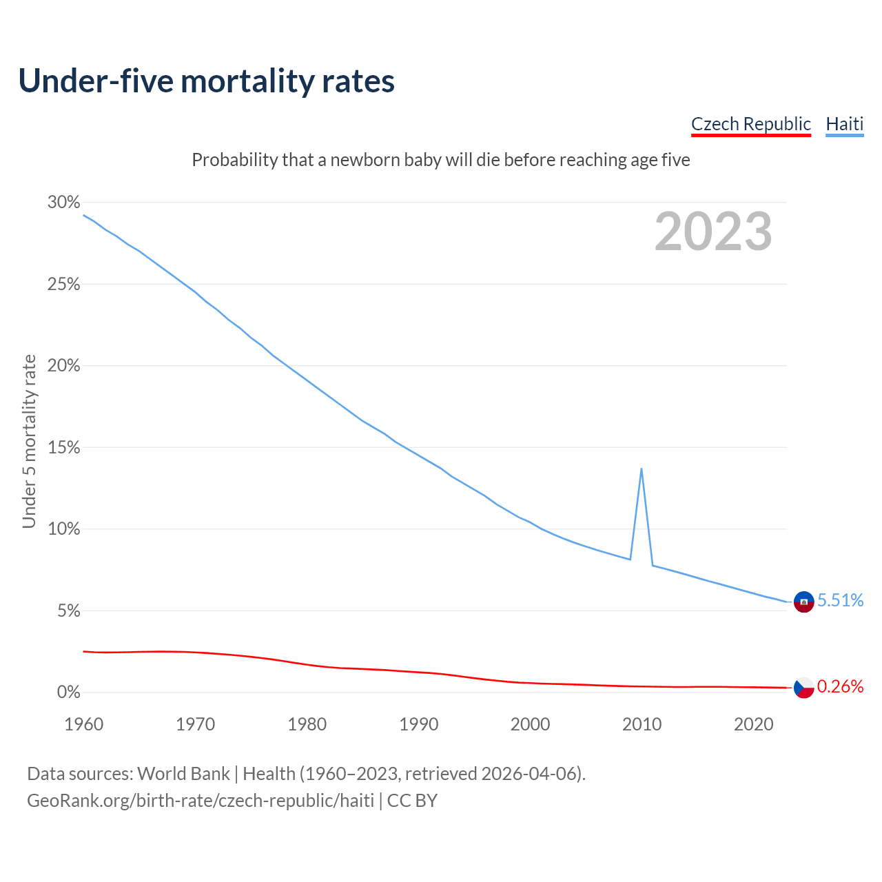 The chance that a newborn baby will die before reaching age five is 0.26% in the Czech Republic and 5.51% in Haiti. Above is a chart with historical data on under-five mortality rates.