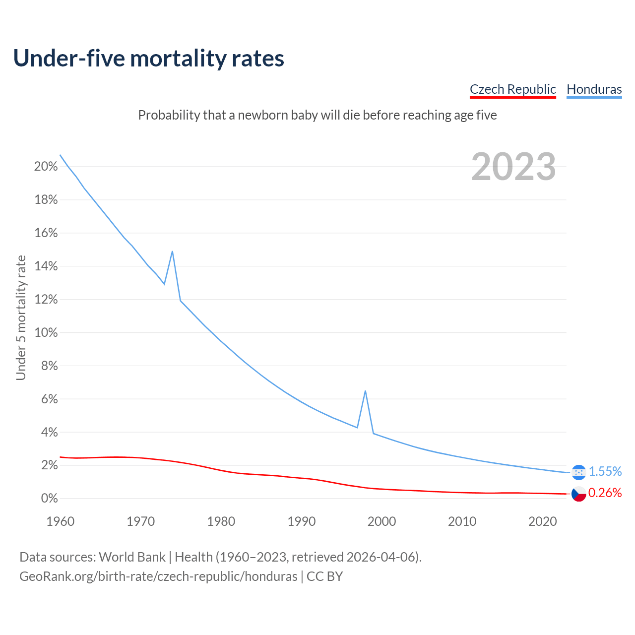 The chance that a newborn baby will die before reaching age five is 0.26% in the Czech Republic and 1.55% in Honduras. Above is a chart with historical data on under-five mortality rates.