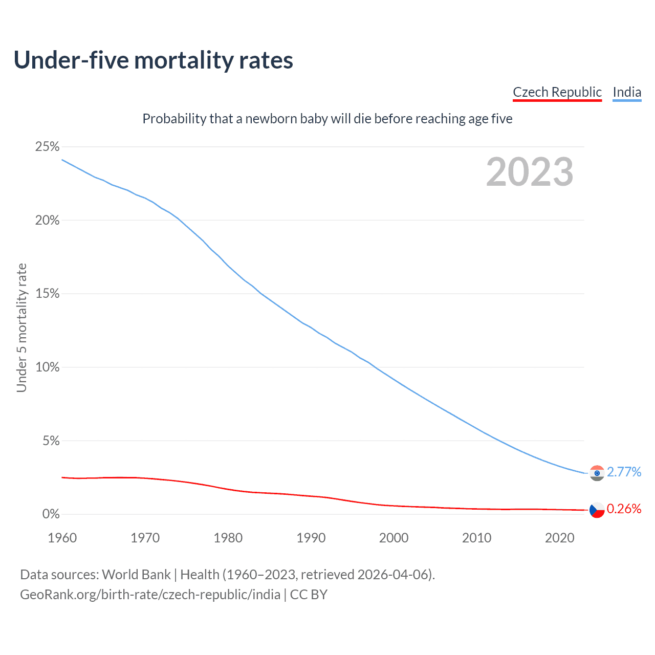 The chance that a newborn baby will die before reaching age five is 0.26% in the Czech Republic and 2.77% in India. Above is a chart with historical data on under-five mortality rates.
