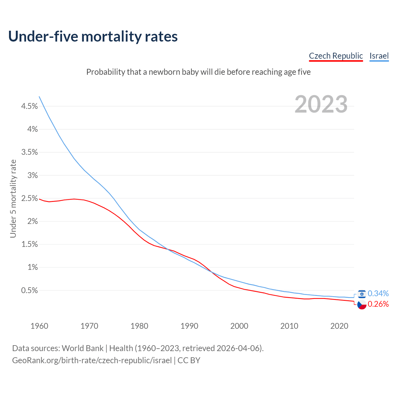 The chance that a newborn baby will die before reaching age five is 0.26% in the Czech Republic and 0.34% in Israel. Above is a chart with historical data on under-five mortality rates.