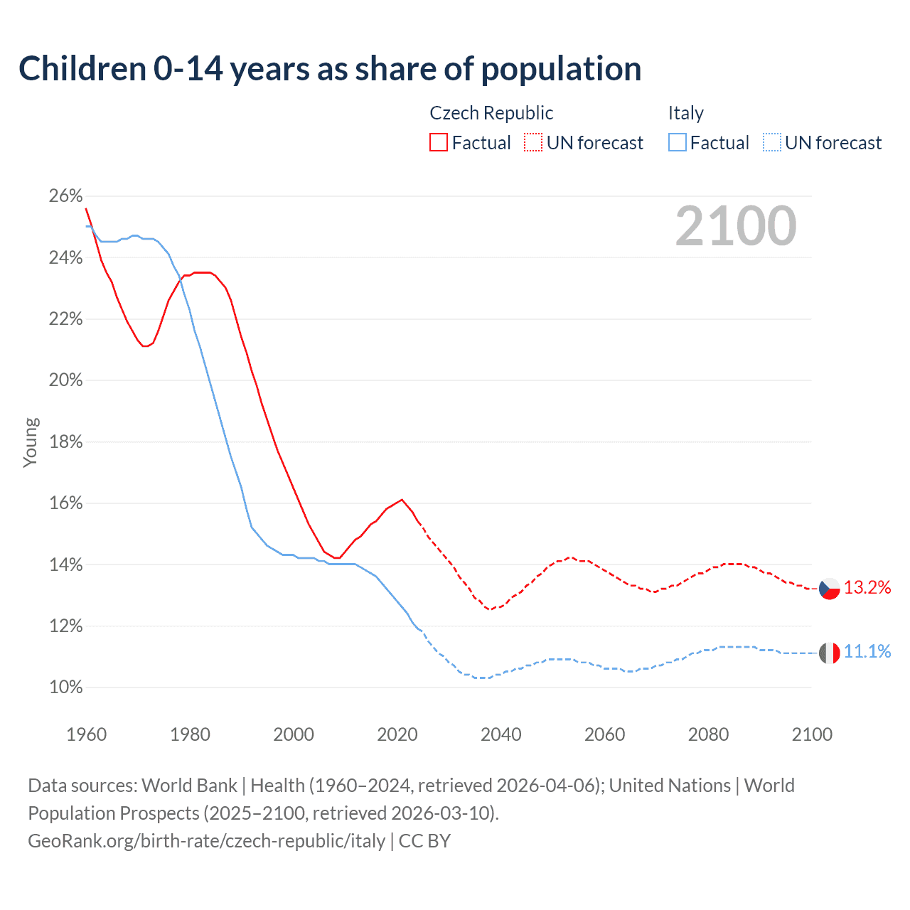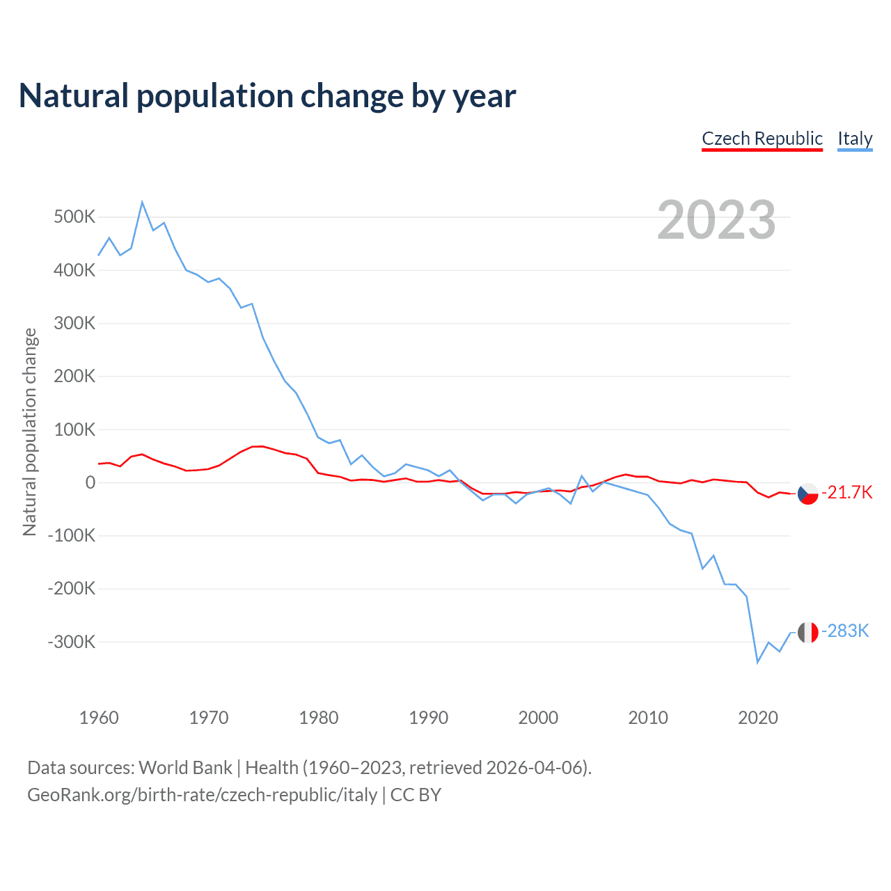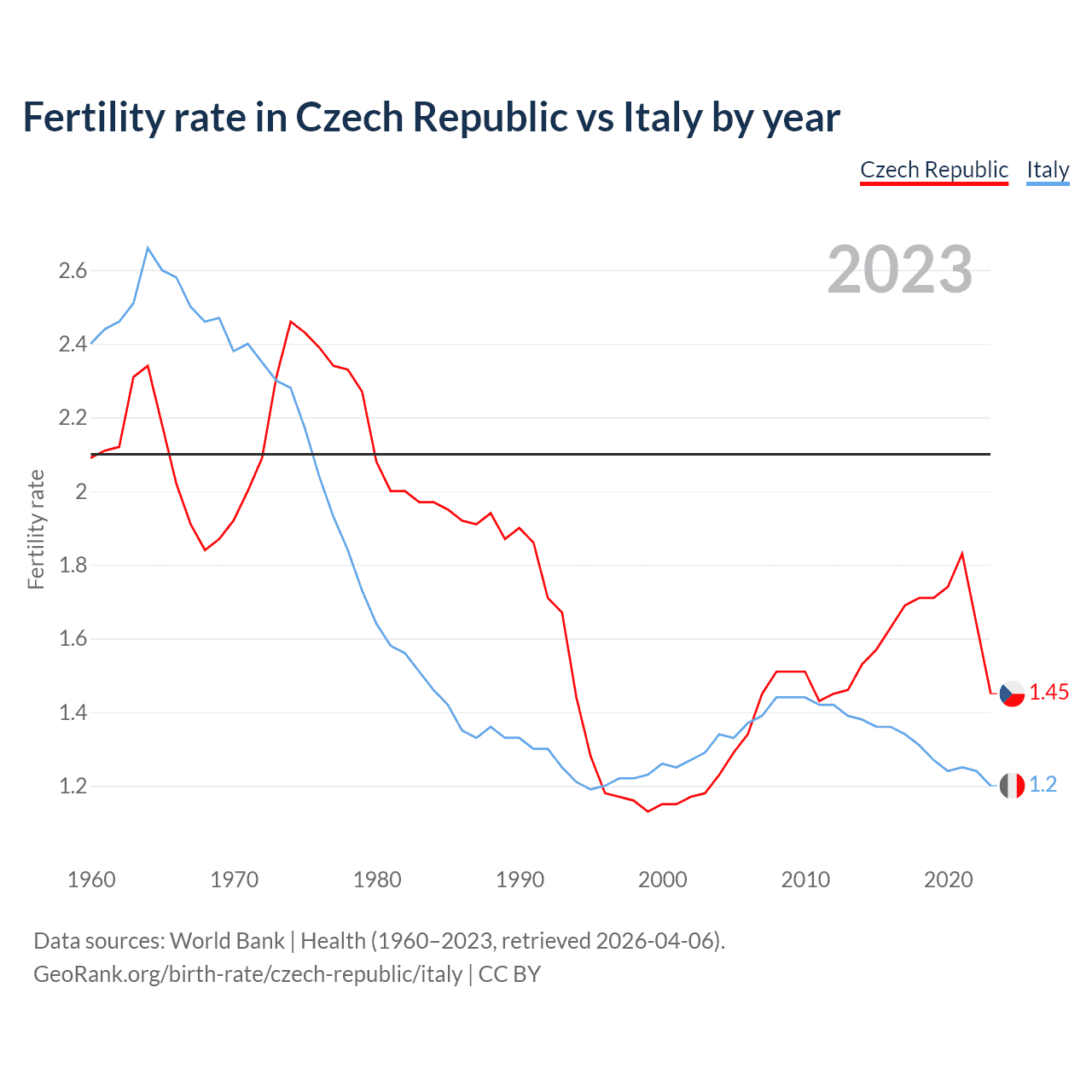 According to the latest available data on birth rates, the fertility rate in the Czech Republic was 1.45 children per woman in 2023, compared to 1.2 in Italy in 2023. The replacement level is considered to be 2.1 children per woman.