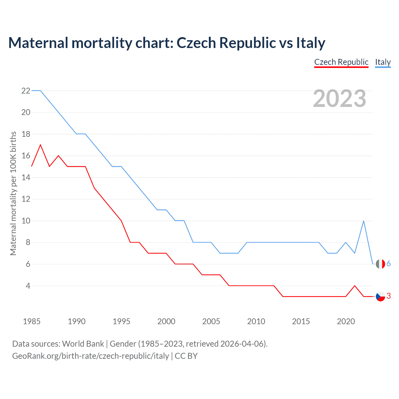 The maternal mortality rate, which is the probability of dying during childbirth or within 42 days of pregnancy termination, is 3 deaths per 100,000 live births in the Czech Republic, compared to 6 deaths in Italy.