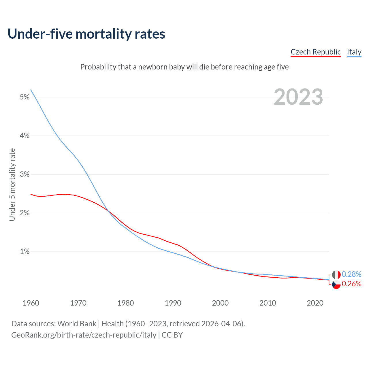 The chance that a newborn baby will die before reaching age five is 0.26% in the Czech Republic and 0.28% in Italy. Above is a chart with historical data on under-five mortality rates.