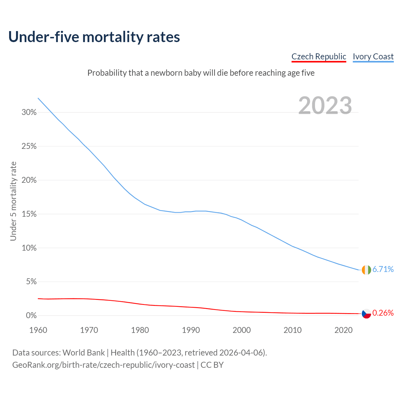 The chance that a newborn baby will die before reaching age five is 0.26% in the Czech Republic and 6.71% in Ivory Coast. Above is a chart with historical data on under-five mortality rates.