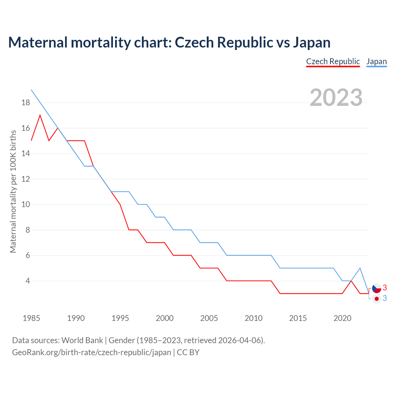 The maternal mortality rate, which is the probability of dying during childbirth or within 42 days of pregnancy termination, is 3 deaths per 100,000 live births in the Czech Republic, compared to 3 deaths in Japan.