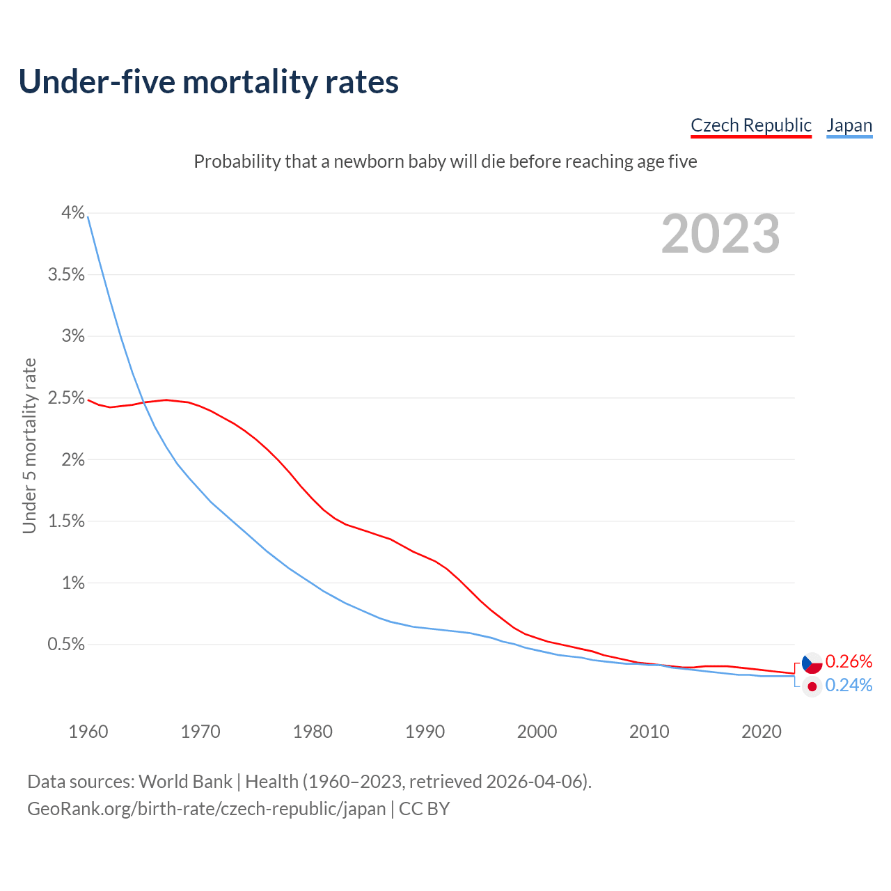 The chance that a newborn baby will die before reaching age five is 0.26% in the Czech Republic and 0.24% in Japan. Above is a chart with historical data on under-five mortality rates.