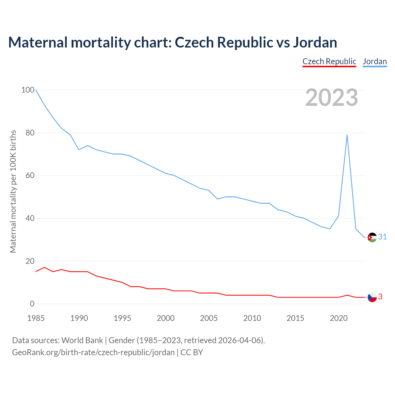 The maternal mortality rate, which is the probability of dying during childbirth or within 42 days of pregnancy termination, is 3 deaths per 100,000 live births in the Czech Republic, compared to 31 deaths in Jordan.