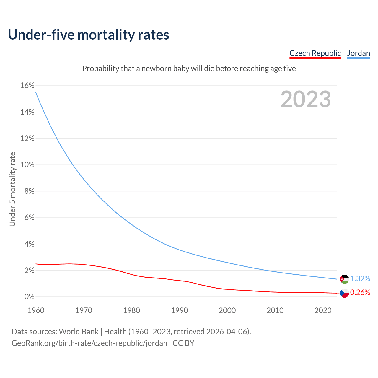 The chance that a newborn baby will die before reaching age five is 0.26% in the Czech Republic and 1.32% in Jordan. Above is a chart with historical data on under-five mortality rates.