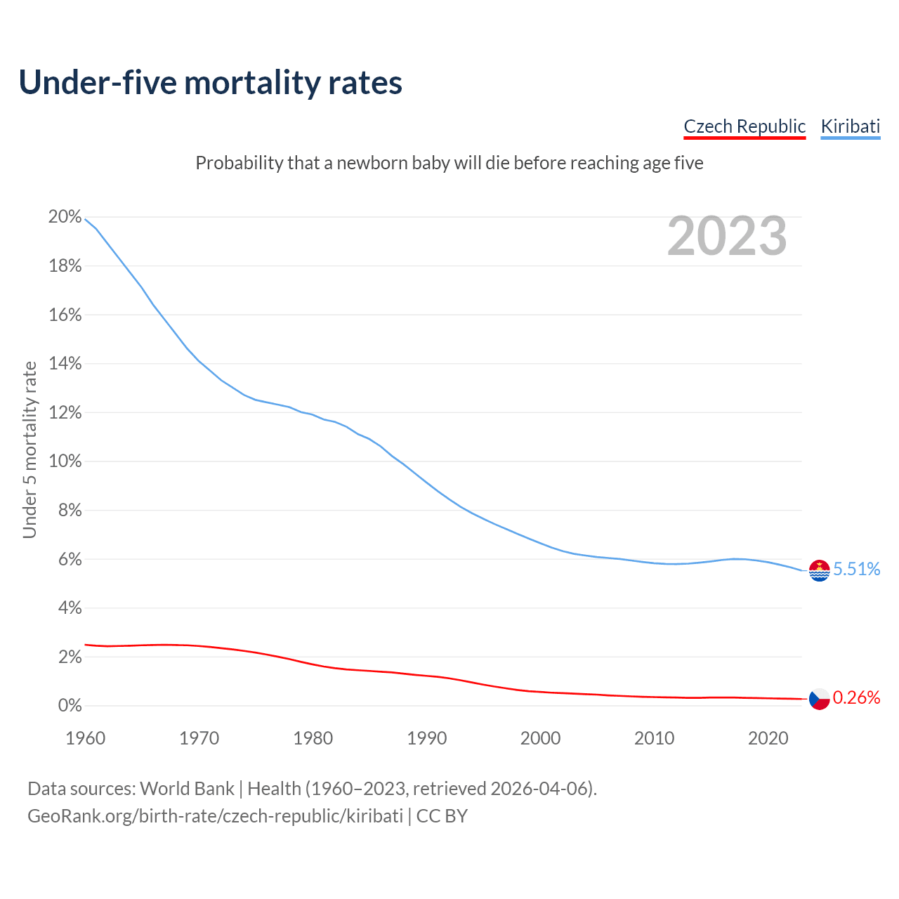 The chance that a newborn baby will die before reaching age five is 0.26% in the Czech Republic and 5.51% in Kiribati. Above is a chart with historical data on under-five mortality rates.