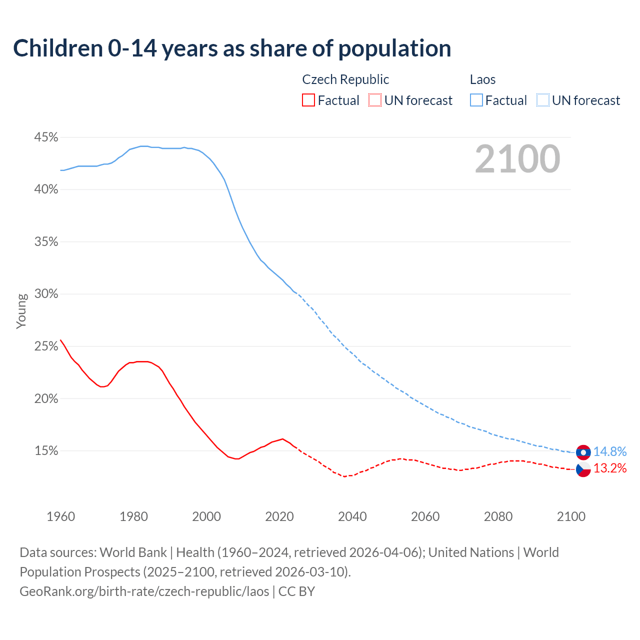 According to the latest available data on birth rates, the fertility rate in the Czech Republic was 1.45 children per woman in 2023, compared to 2.42 in Laos in 2023. The replacement level is considered to be 2.1 children per woman.