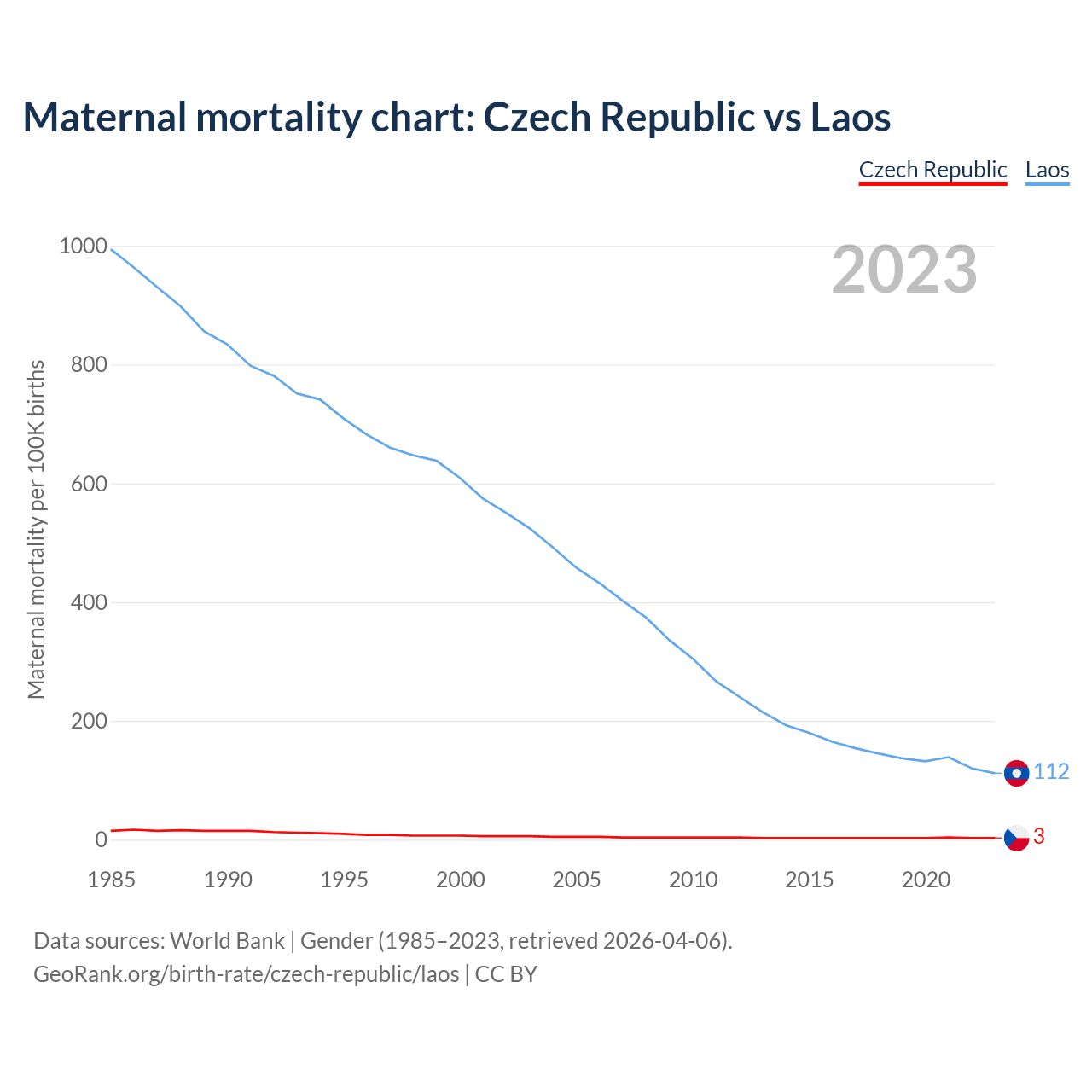 The maternal mortality rate, which is the probability of dying during childbirth or within 42 days of pregnancy termination, is 3 deaths per 100,000 live births in the Czech Republic, compared to 112 deaths in Laos.