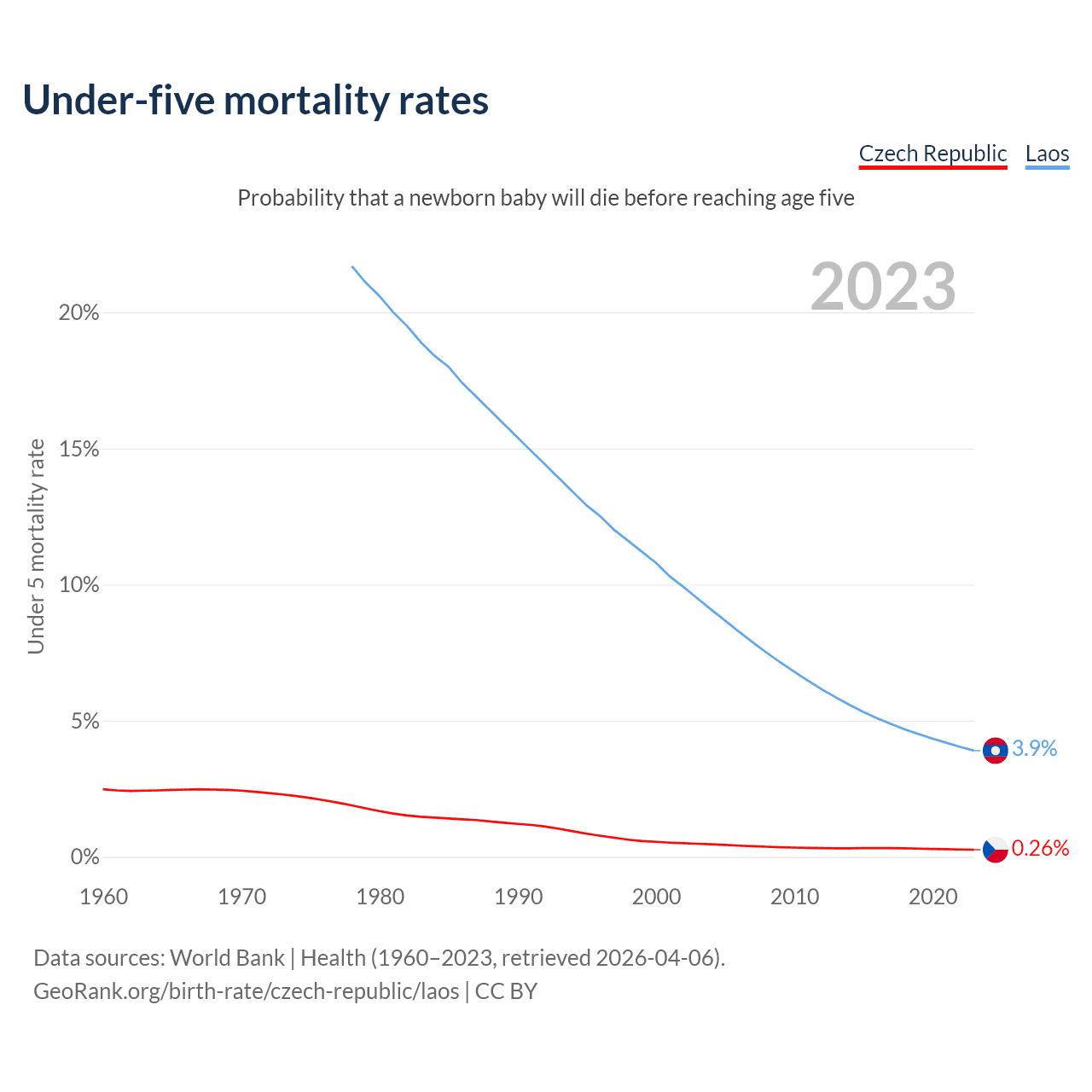 The chance that a newborn baby will die before reaching age five is 0.26% in the Czech Republic and 3.9% in Laos. Above is a chart with historical data on under-five mortality rates.