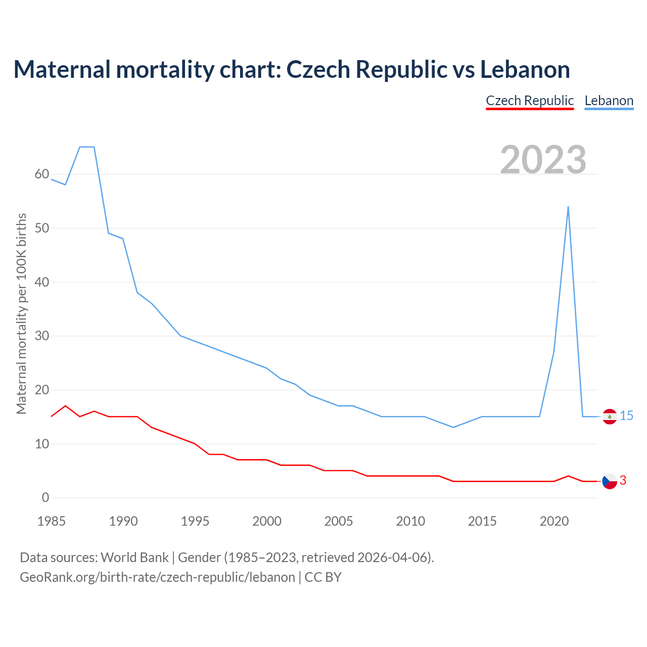 The maternal mortality rate, which is the probability of dying during childbirth or within 42 days of pregnancy termination, is 3 deaths per 100,000 live births in the Czech Republic, compared to 15 deaths in Lebanon.