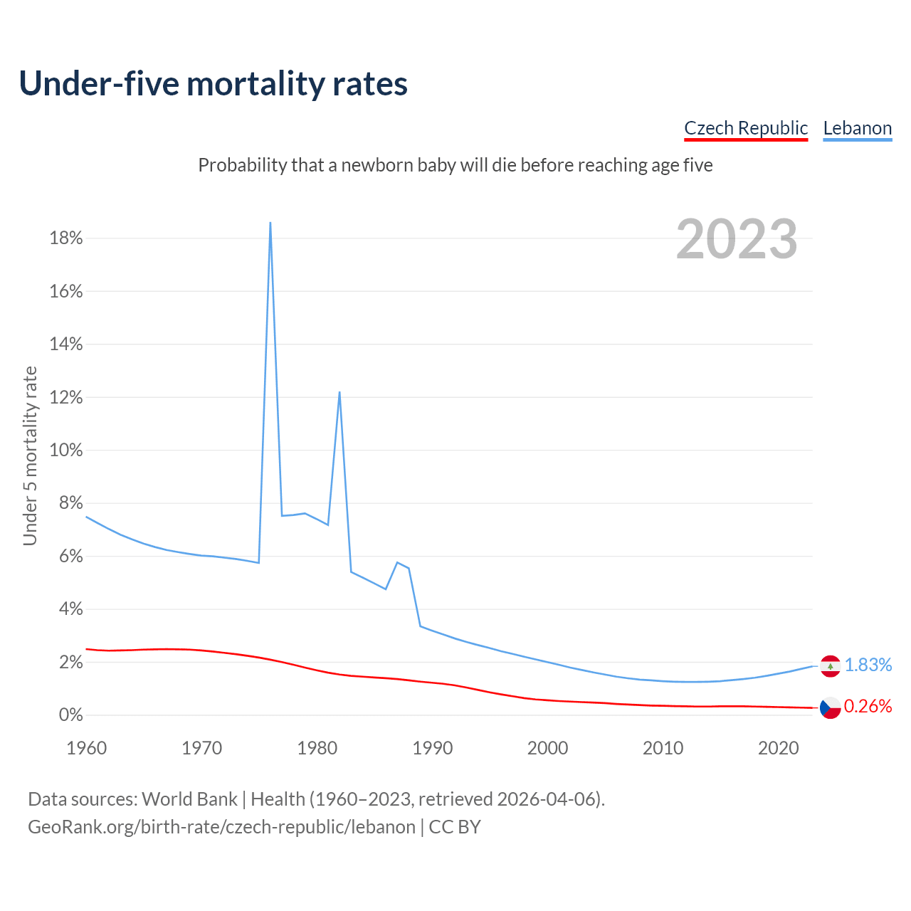 The chance that a newborn baby will die before reaching age five is 0.26% in the Czech Republic and 1.83% in Lebanon. Above is a chart with historical data on under-five mortality rates.
