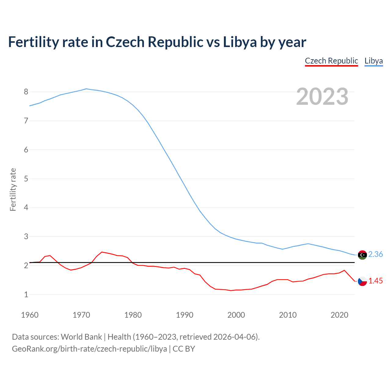 According to the latest available data on birth rates, the fertility rate in the Czech Republic was 1.45 children per woman in 2023, compared to 2.36 in Libya in 2023. The replacement level is considered to be 2.1 children per woman.