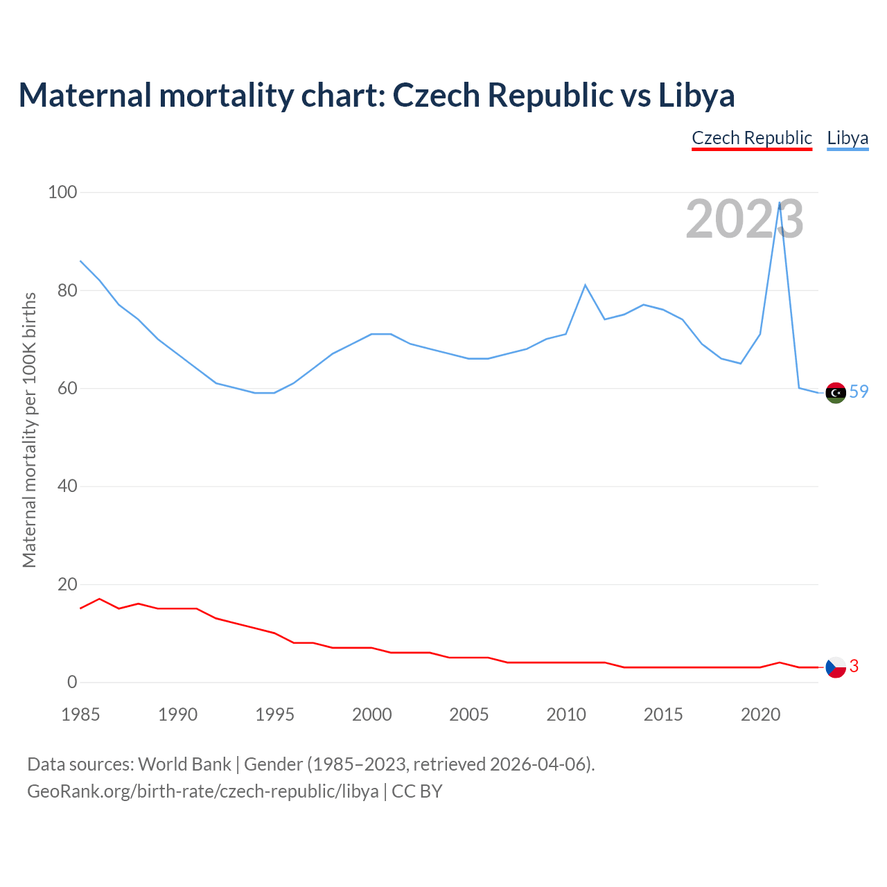 The maternal mortality rate, which is the probability of dying during childbirth or within 42 days of pregnancy termination, is 3 deaths per 100,000 live births in the Czech Republic, compared to 59 deaths in Libya.