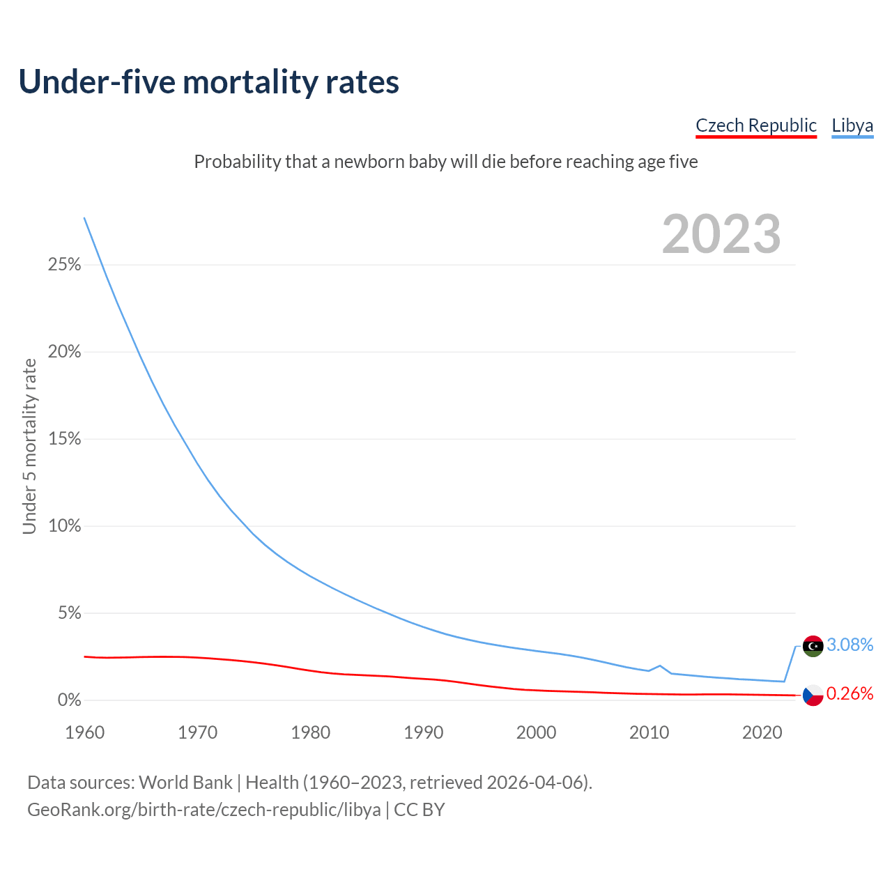 The chance that a newborn baby will die before reaching age five is 0.26% in the Czech Republic and 3.08% in Libya. Above is a chart with historical data on under-five mortality rates.