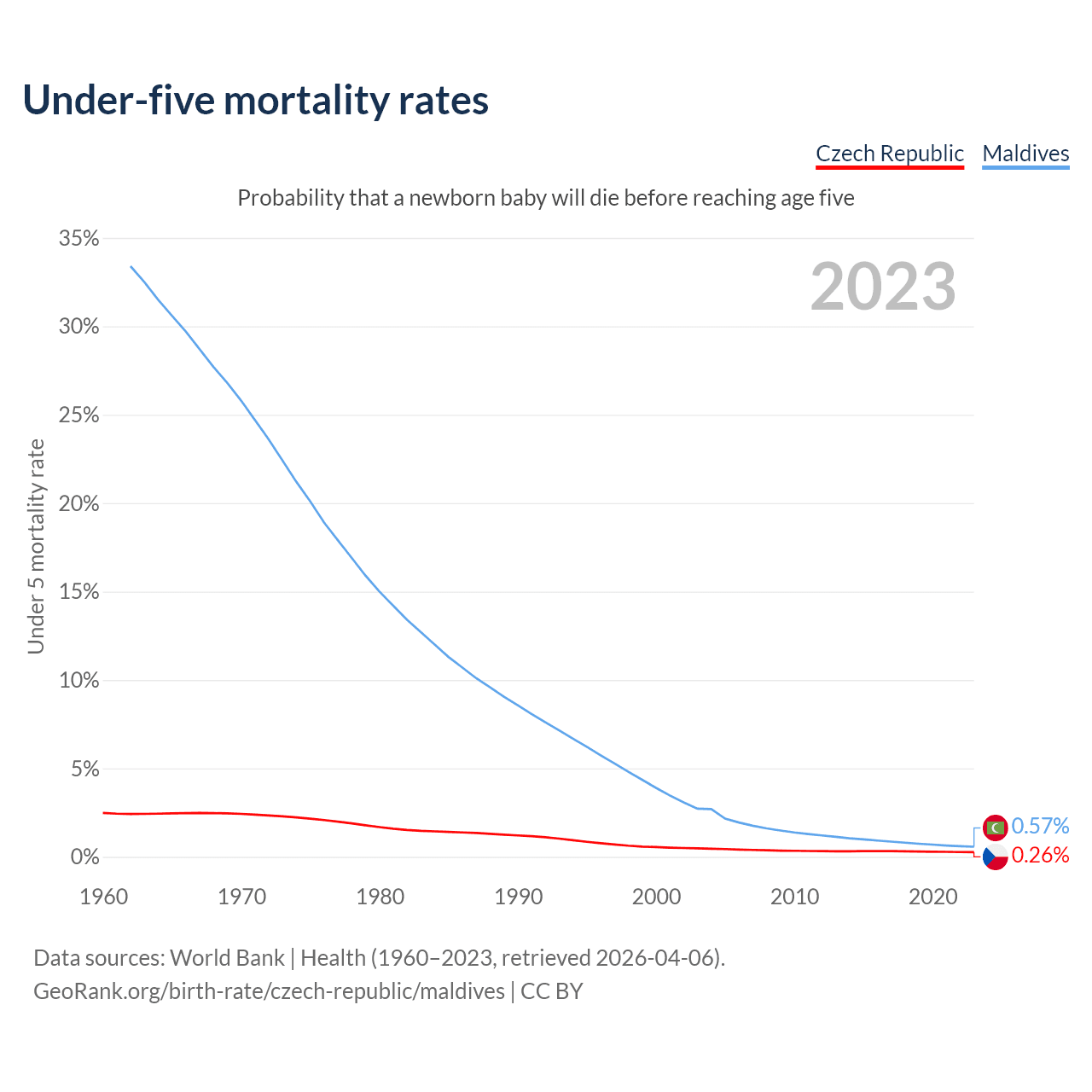 The chance that a newborn baby will die before reaching age five is 0.26% in the Czech Republic and 0.57% in Maldives. Above is a chart with historical data on under-five mortality rates.