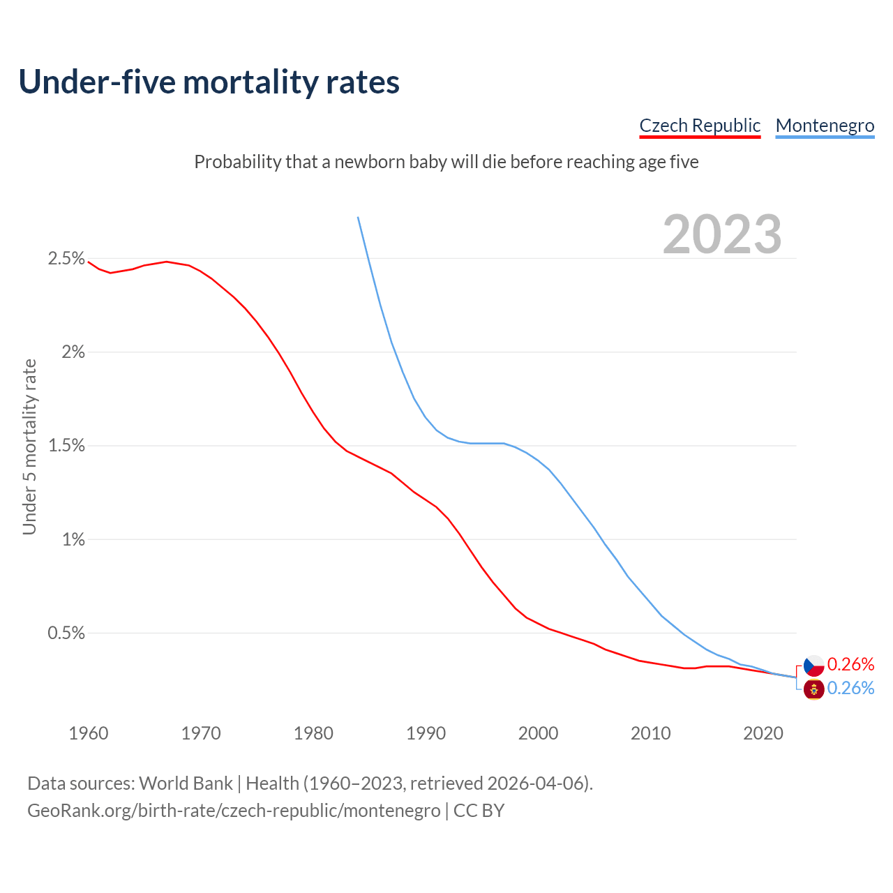 The chance that a newborn baby will die before reaching age five is 0.26% in the Czech Republic and 0.26% in Montenegro. Above is a chart with historical data on under-five mortality rates.