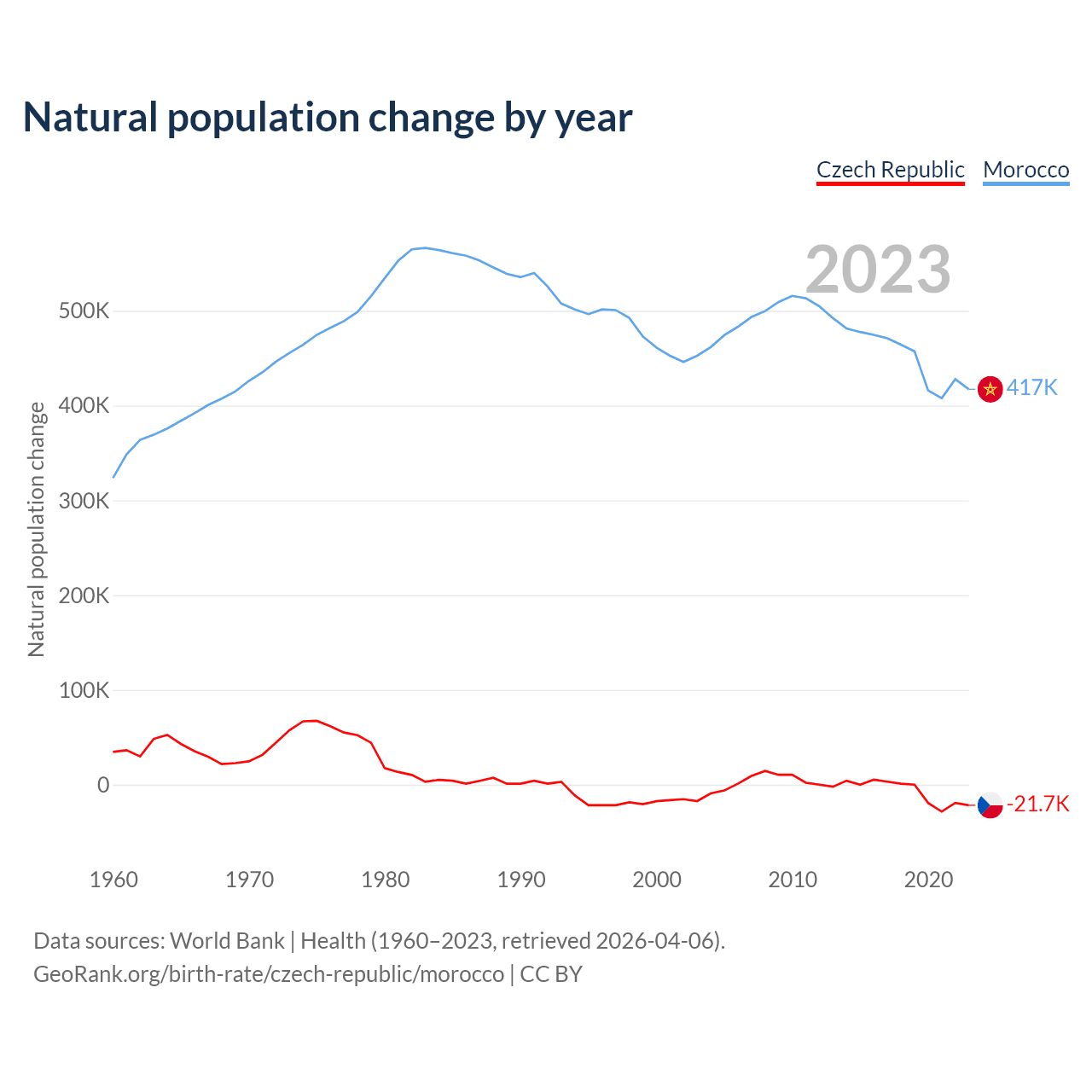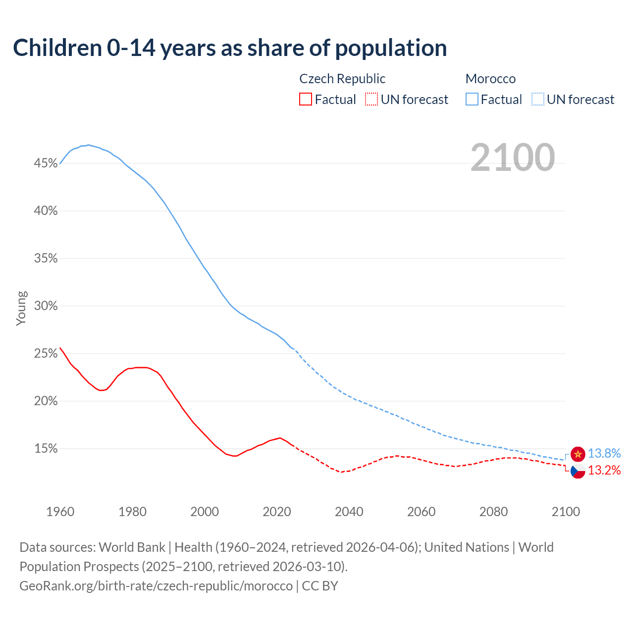 The Czech Republic has an annual birth rate of 8.4 births per 1,000 people, compared to 16.7 for Morocco. The average number of children a woman is expected to have during her lifetime — the fertility rate, is 1.45 in the Czech Republic and 2.23 in Morocco — 53.8% difference.