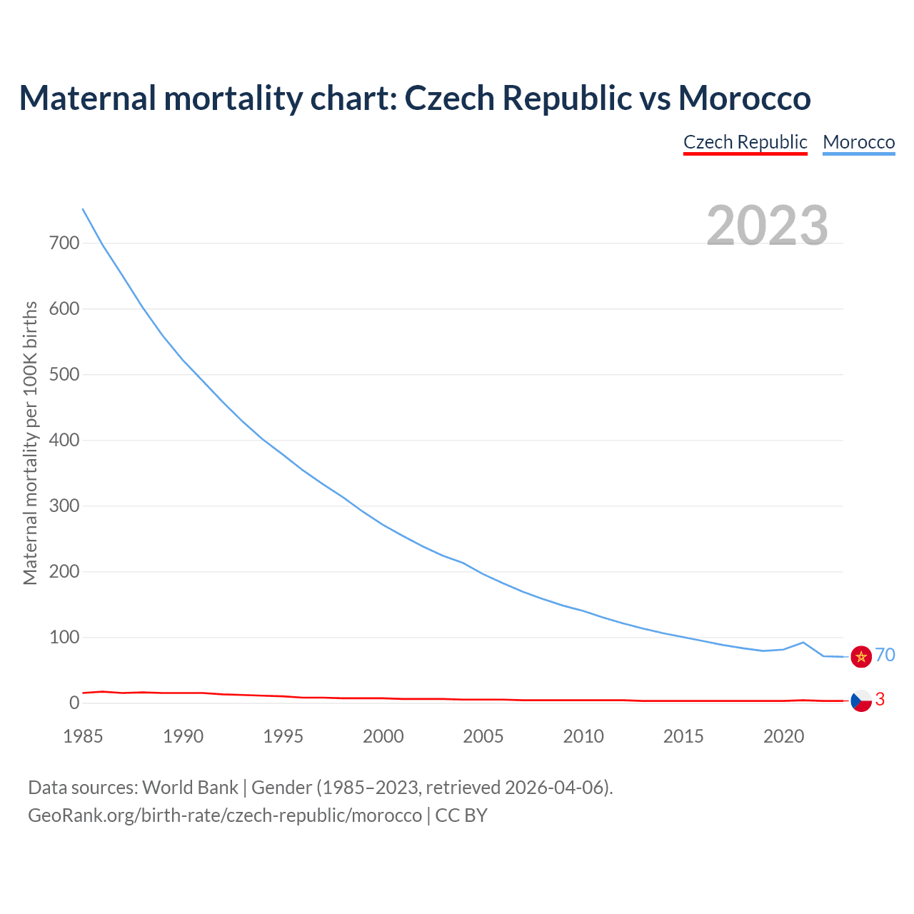 The maternal mortality rate, which is the probability of dying during childbirth or within 42 days of pregnancy termination, is 3 deaths per 100,000 live births in the Czech Republic, compared to 70 deaths in Morocco.