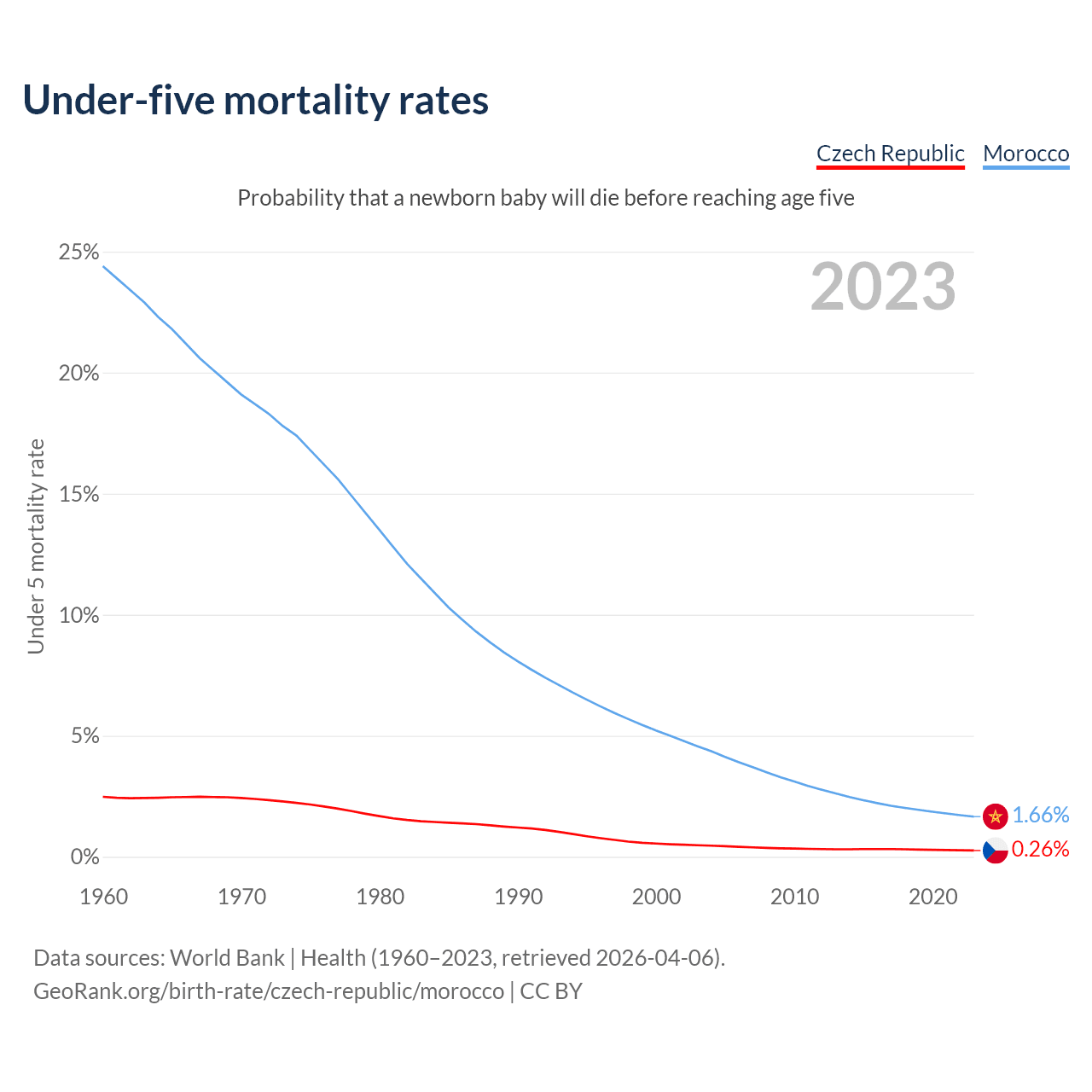 The chance that a newborn baby will die before reaching age five is 0.26% in the Czech Republic and 1.66% in Morocco. Above is a chart with historical data on under-five mortality rates.