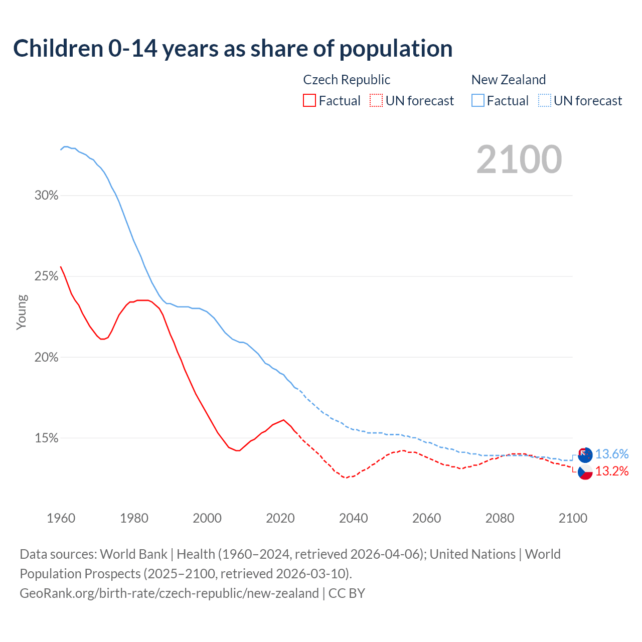 According to the latest available data on birth rates, the fertility rate in the Czech Republic was 1.45 children per woman in 2023, compared to 1.56 in New Zealand in 2023. The replacement level is considered to be 2.1 children per woman.
