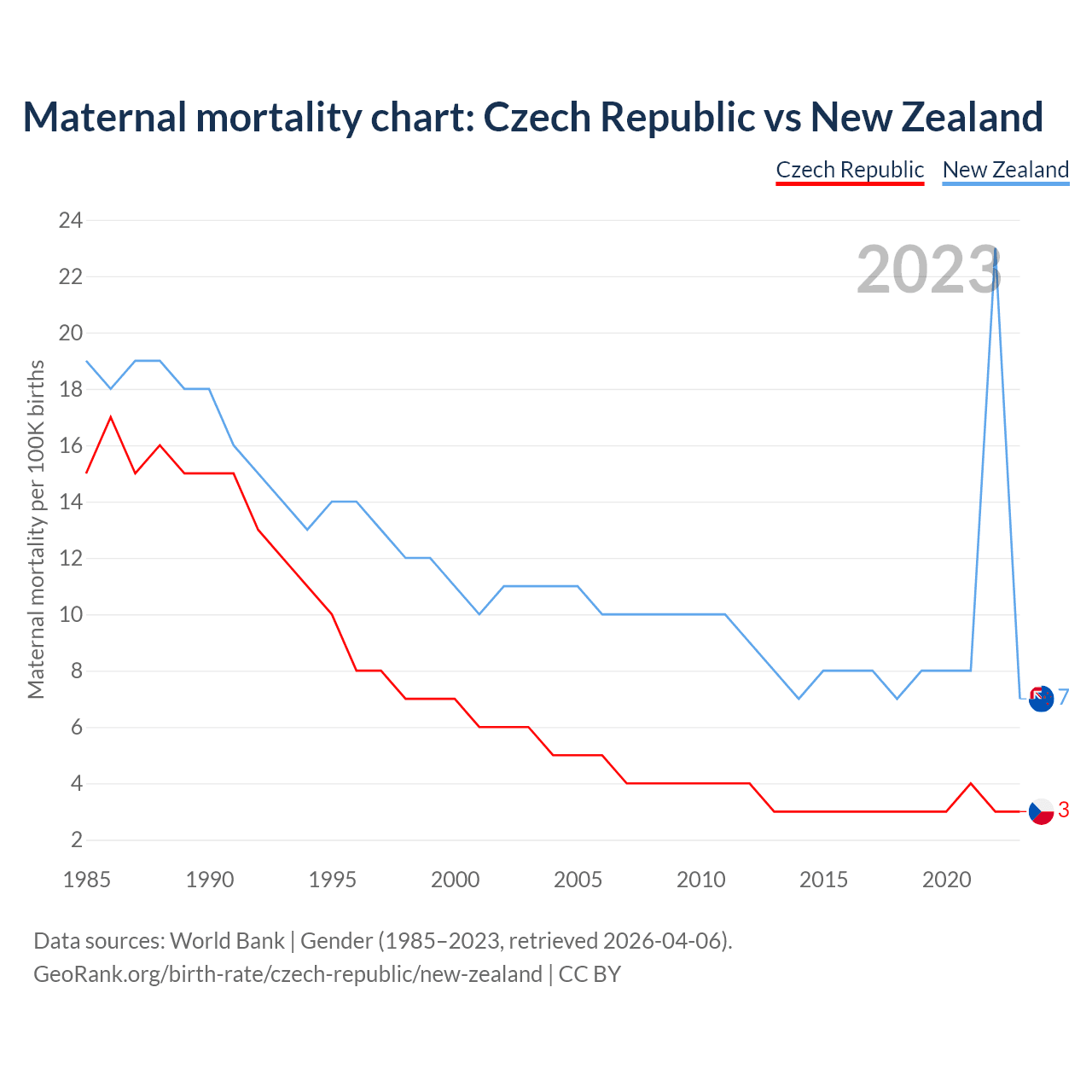 The maternal mortality rate, which is the probability of dying during childbirth or within 42 days of pregnancy termination, is 3 deaths per 100,000 live births in the Czech Republic, compared to 7 deaths in New Zealand.