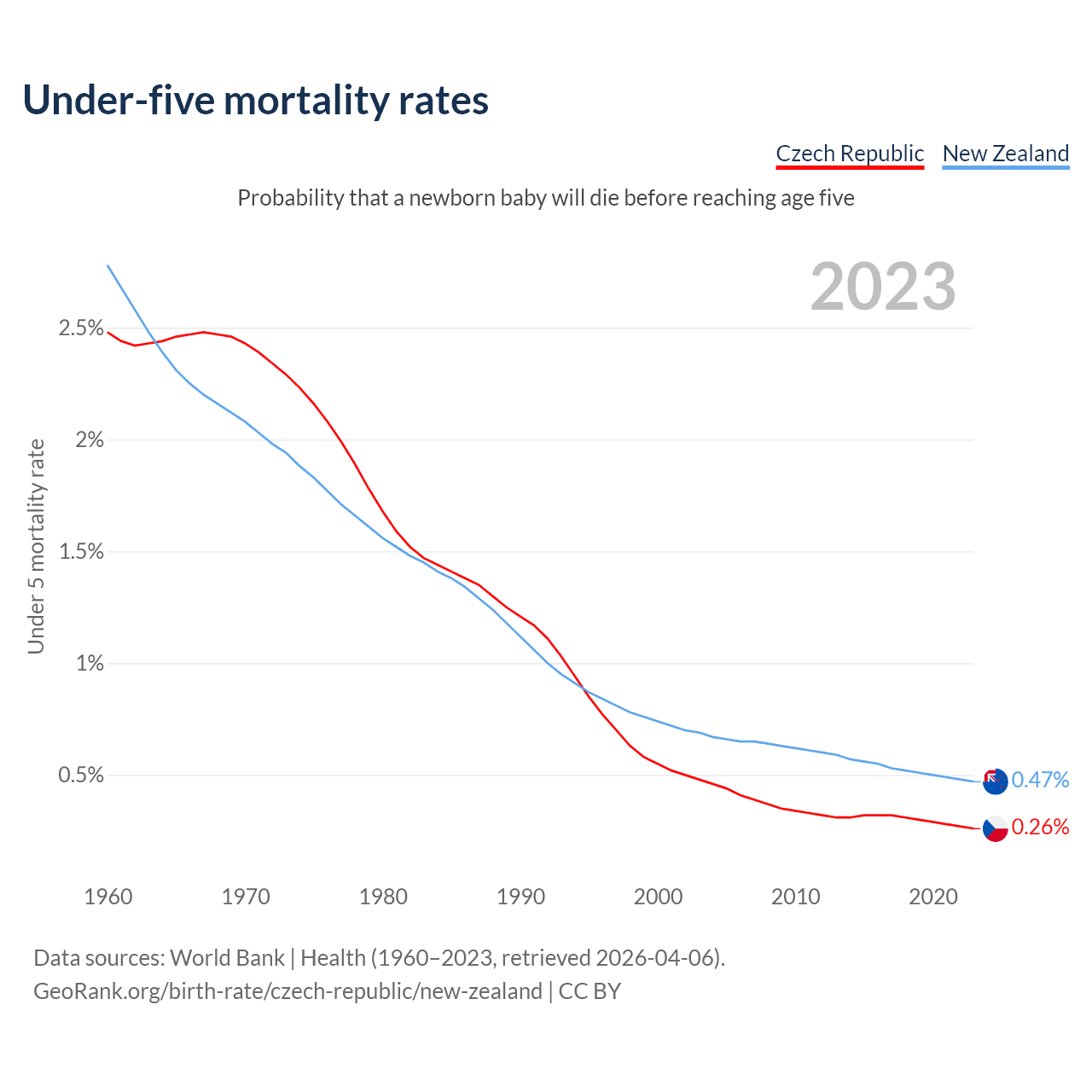 The chance that a newborn baby will die before reaching age five is 0.26% in the Czech Republic and 0.47% in New Zealand. Above is a chart with historical data on under-five mortality rates.