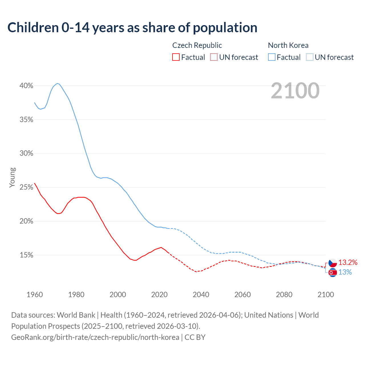 The Czech Republic has an annual birth rate of 8.4 births per 1,000 people, compared to 12.9 for North Korea. The average number of children a woman is expected to have during her lifetime — the fertility rate, is 1.45 in the Czech Republic and 1.78 in North Korea — 22.8% difference.