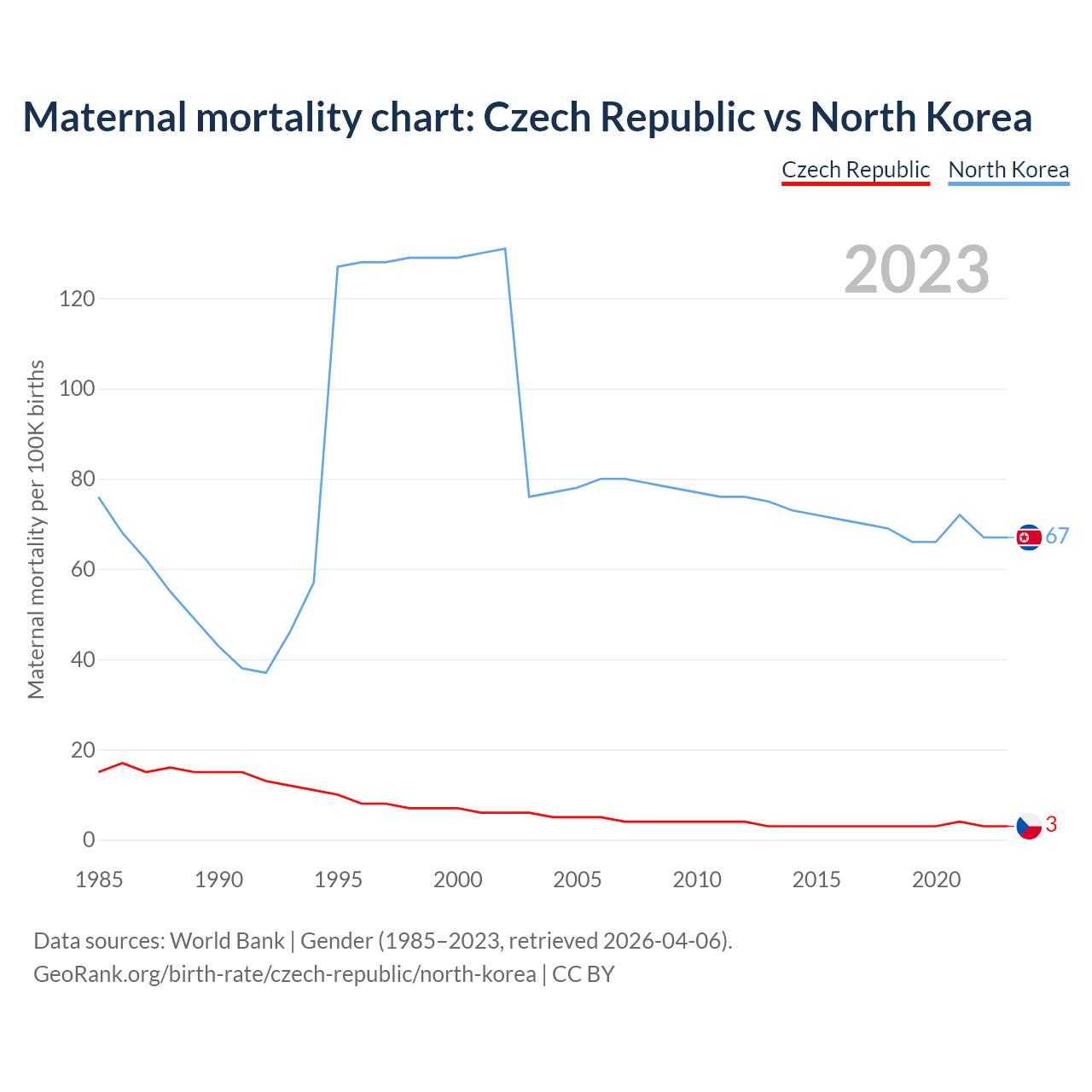 The maternal mortality rate, which is the probability of dying during childbirth or within 42 days of pregnancy termination, is 3 deaths per 100,000 live births in the Czech Republic, compared to 67 deaths in North Korea.