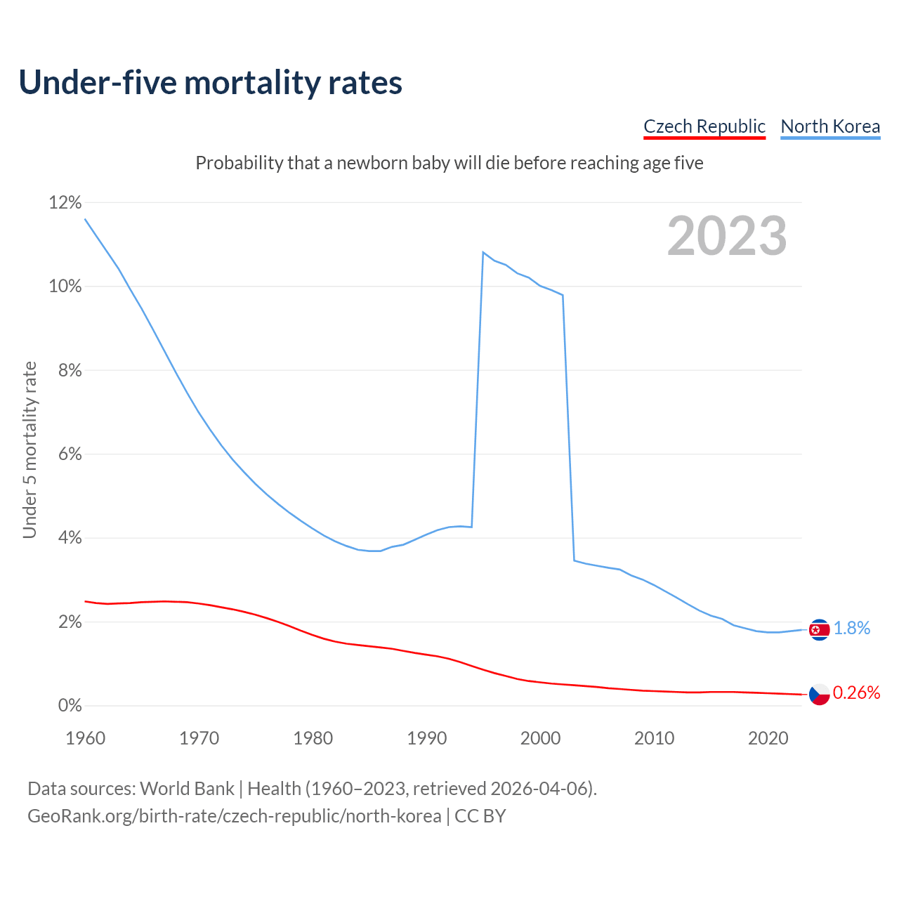The chance that a newborn baby will die before reaching age five is 0.26% in the Czech Republic and 1.8% in North Korea. Above is a chart with historical data on under-five mortality rates.