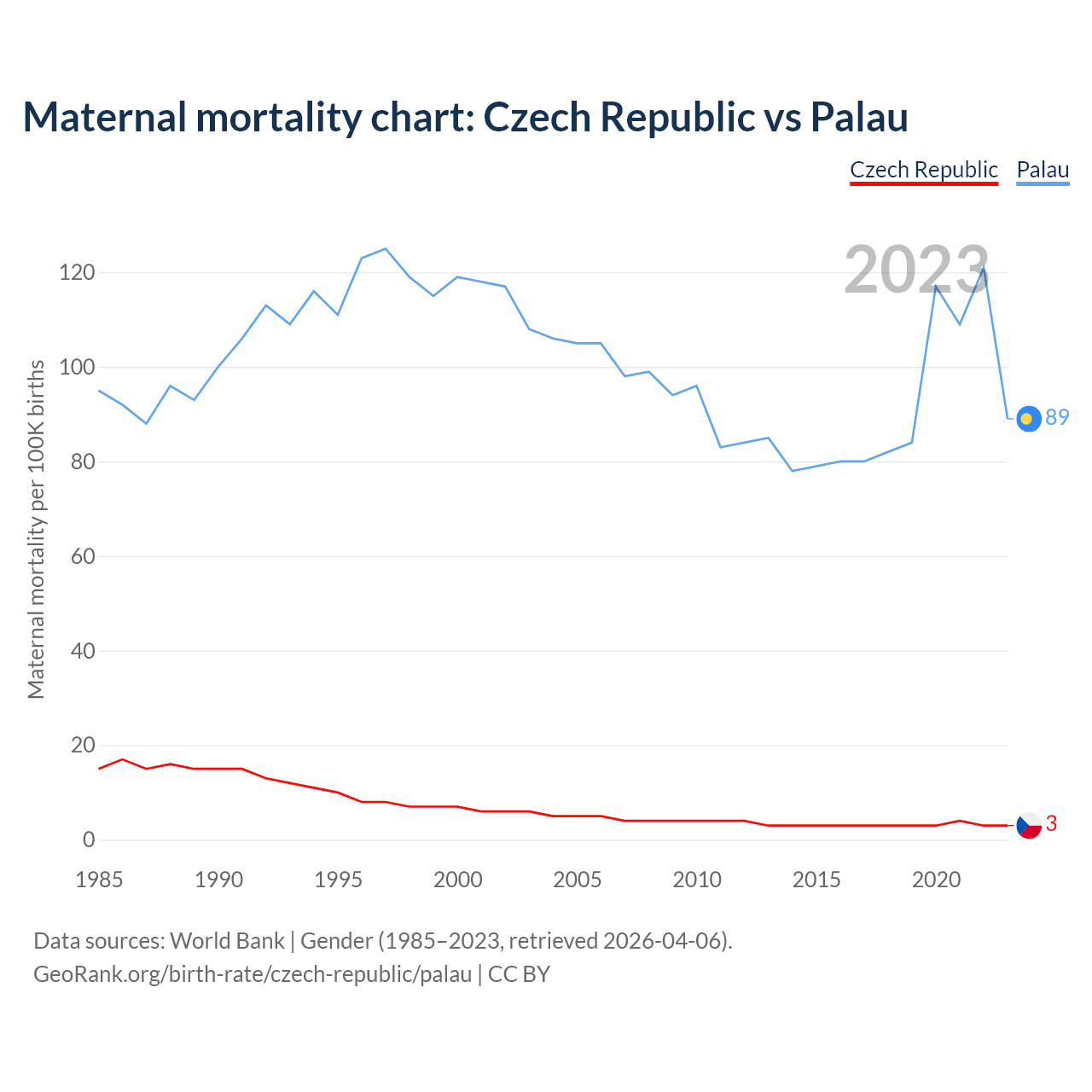 The maternal mortality rate, which is the probability of dying during childbirth or within 42 days of pregnancy termination, is 3 deaths per 100,000 live births in the Czech Republic, compared to 89 deaths in Palau.