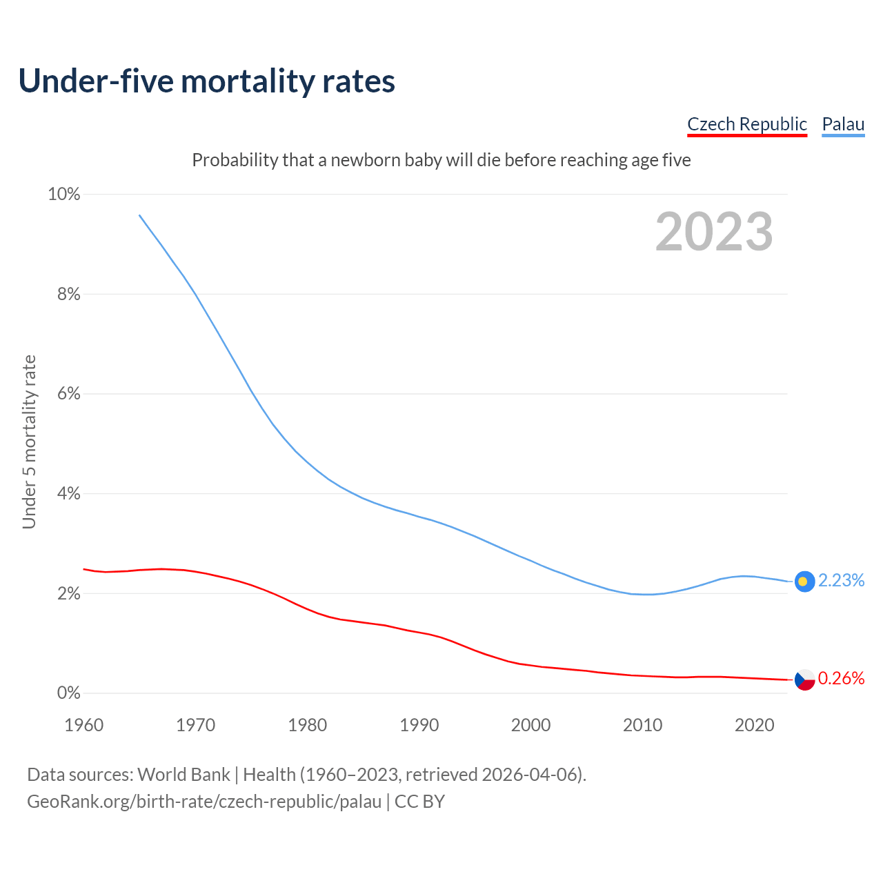 The chance that a newborn baby will die before reaching age five is 0.26% in the Czech Republic and 2.23% in Palau. Above is a chart with historical data on under-five mortality rates.
