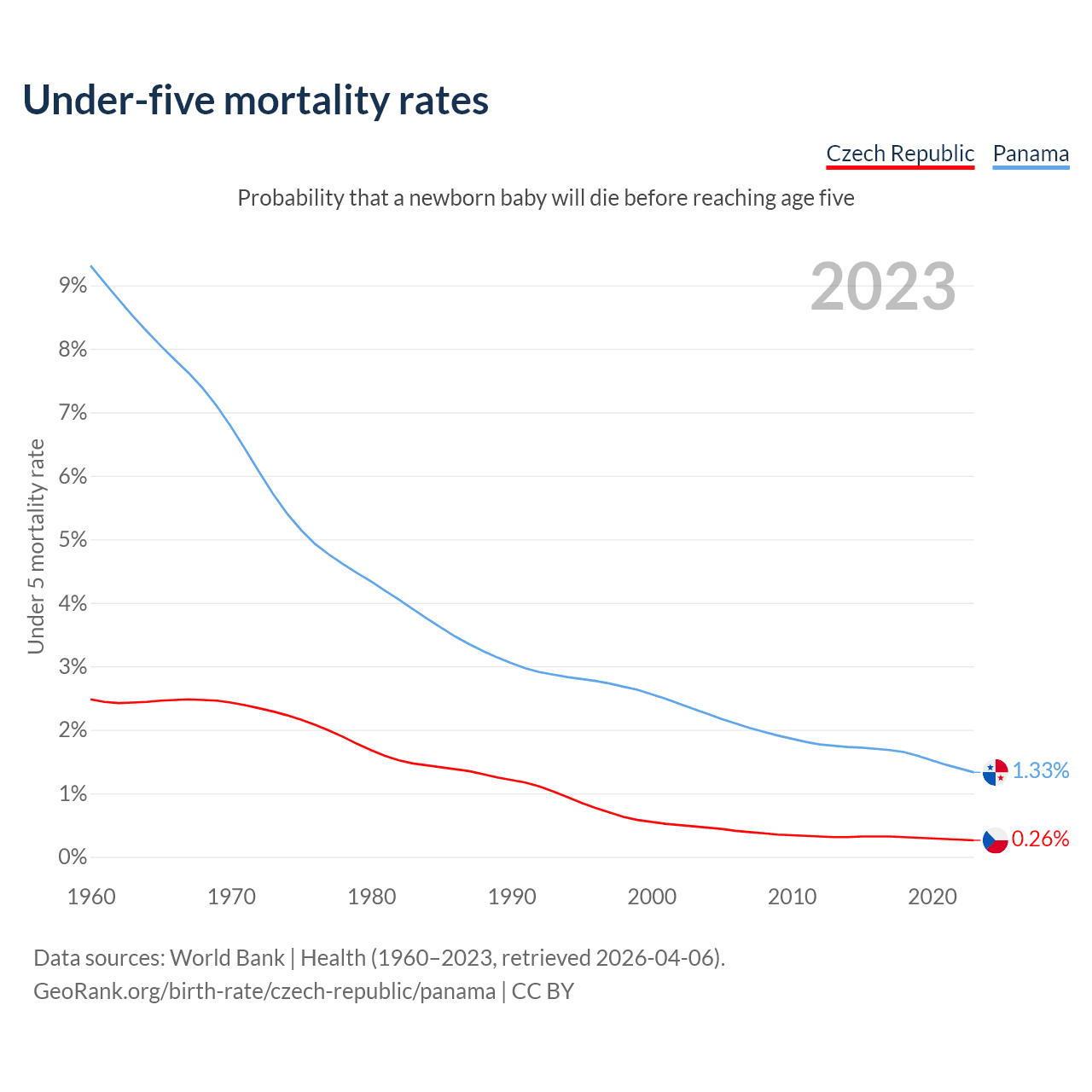 The chance that a newborn baby will die before reaching age five is 0.26% in the Czech Republic and 1.33% in Panama. Above is a chart with historical data on under-five mortality rates.