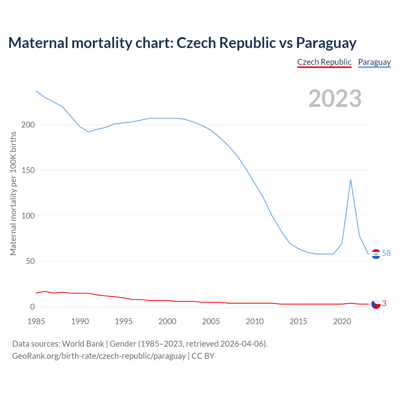 The maternal mortality rate, which is the probability of dying during childbirth or within 42 days of pregnancy termination, is 3 deaths per 100,000 live births in the Czech Republic, compared to 58 deaths in Paraguay.