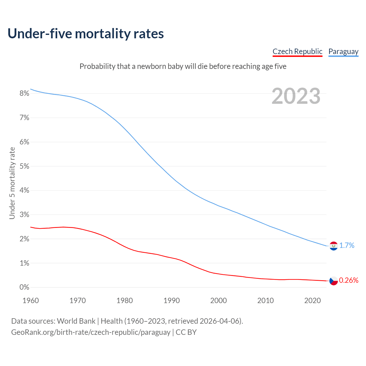 The chance that a newborn baby will die before reaching age five is 0.26% in the Czech Republic and 1.7% in Paraguay. Above is a chart with historical data on under-five mortality rates.