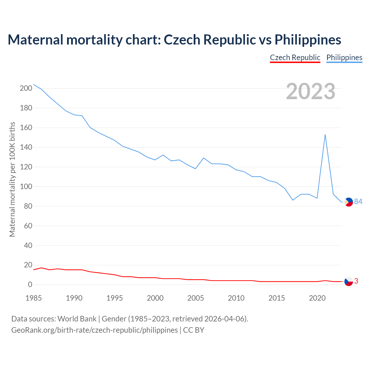 The maternal mortality rate, which is the probability of dying during childbirth or within 42 days of pregnancy termination, is 3 deaths per 100,000 live births in the Czech Republic, compared to 84 deaths in the Philippines.