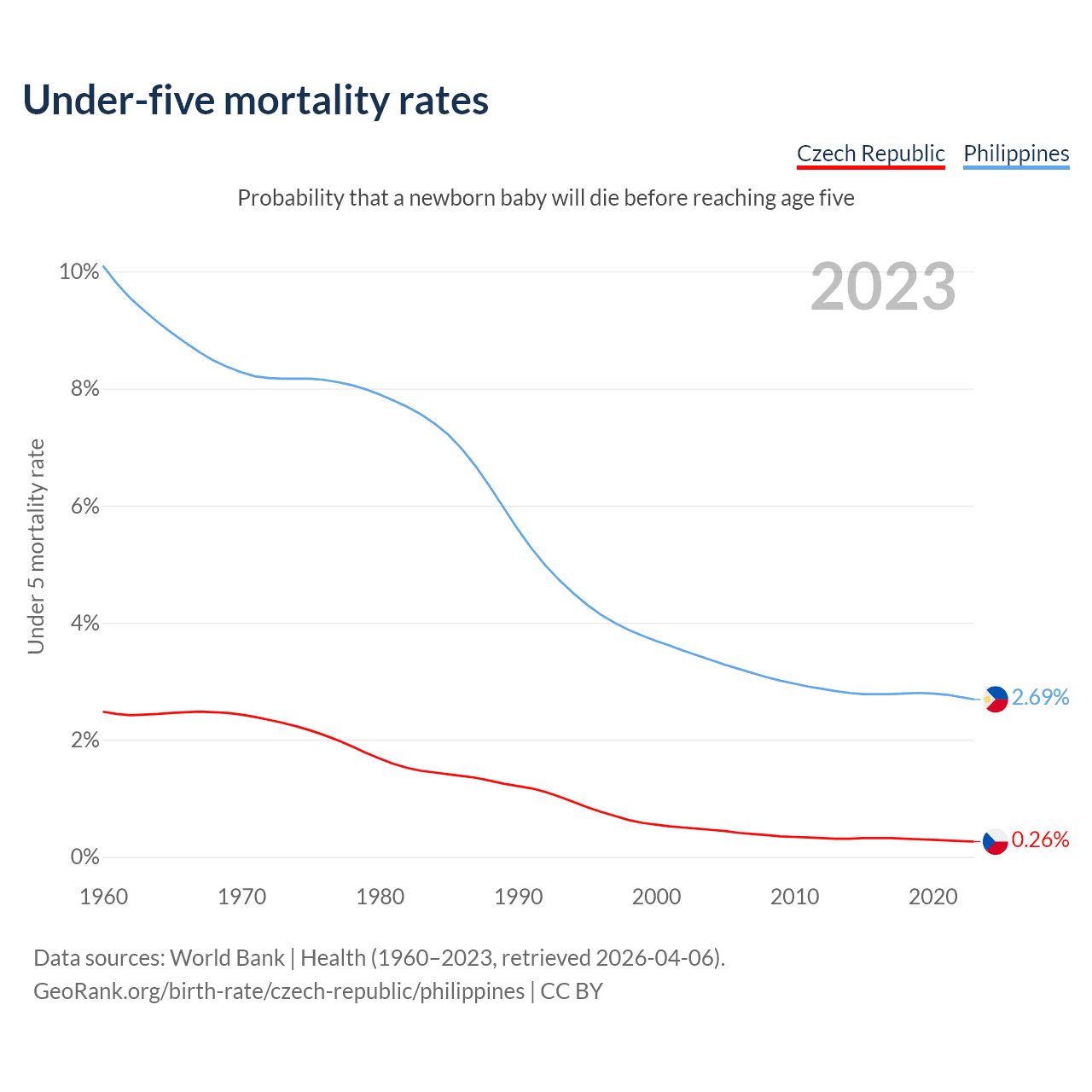 The chance that a newborn baby will die before reaching age five is 0.26% in the Czech Republic and 2.69% in the Philippines. Above is a chart with historical data on under-five mortality rates.