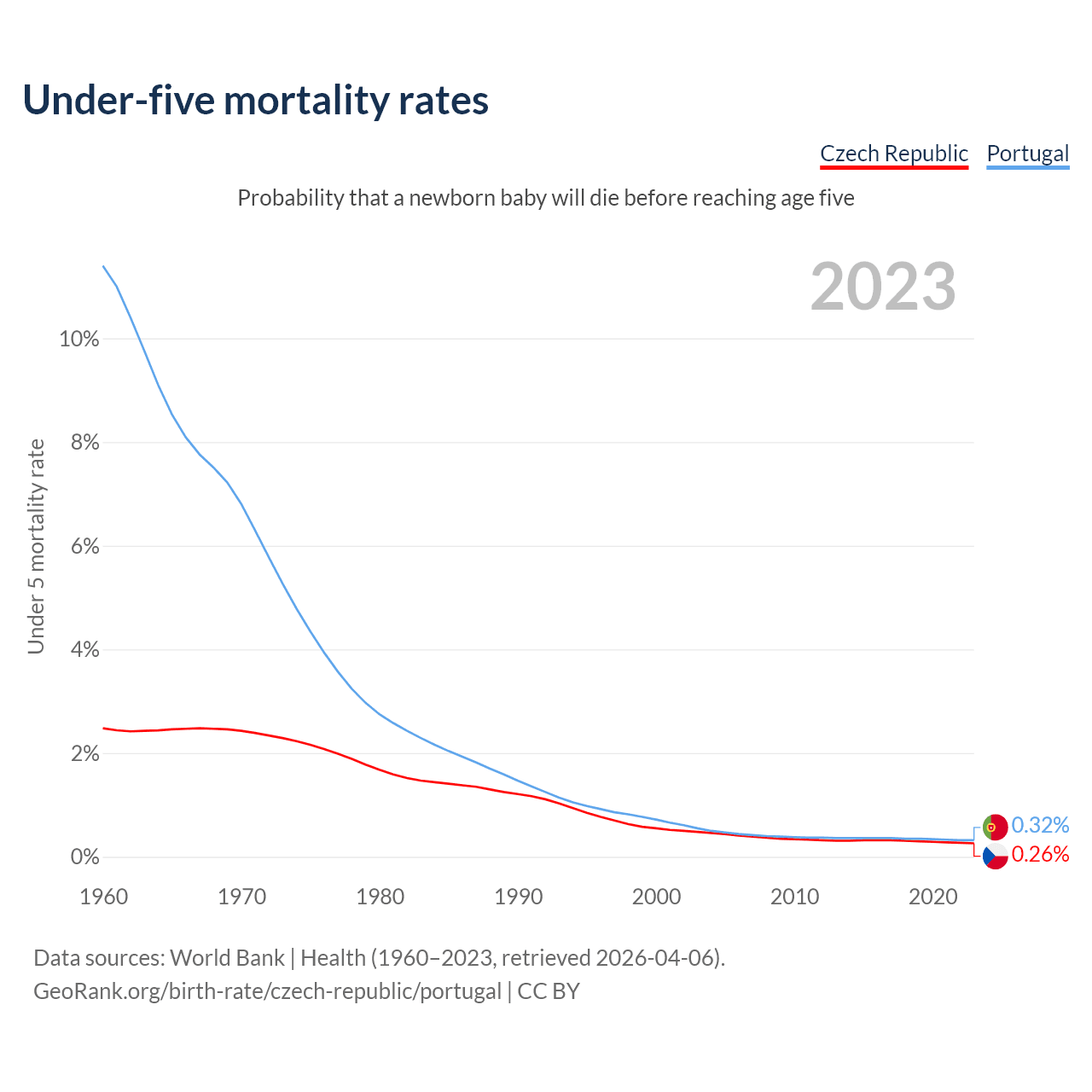 The chance that a newborn baby will die before reaching age five is 0.26% in the Czech Republic and 0.32% in Portugal. Above is a chart with historical data on under-five mortality rates.