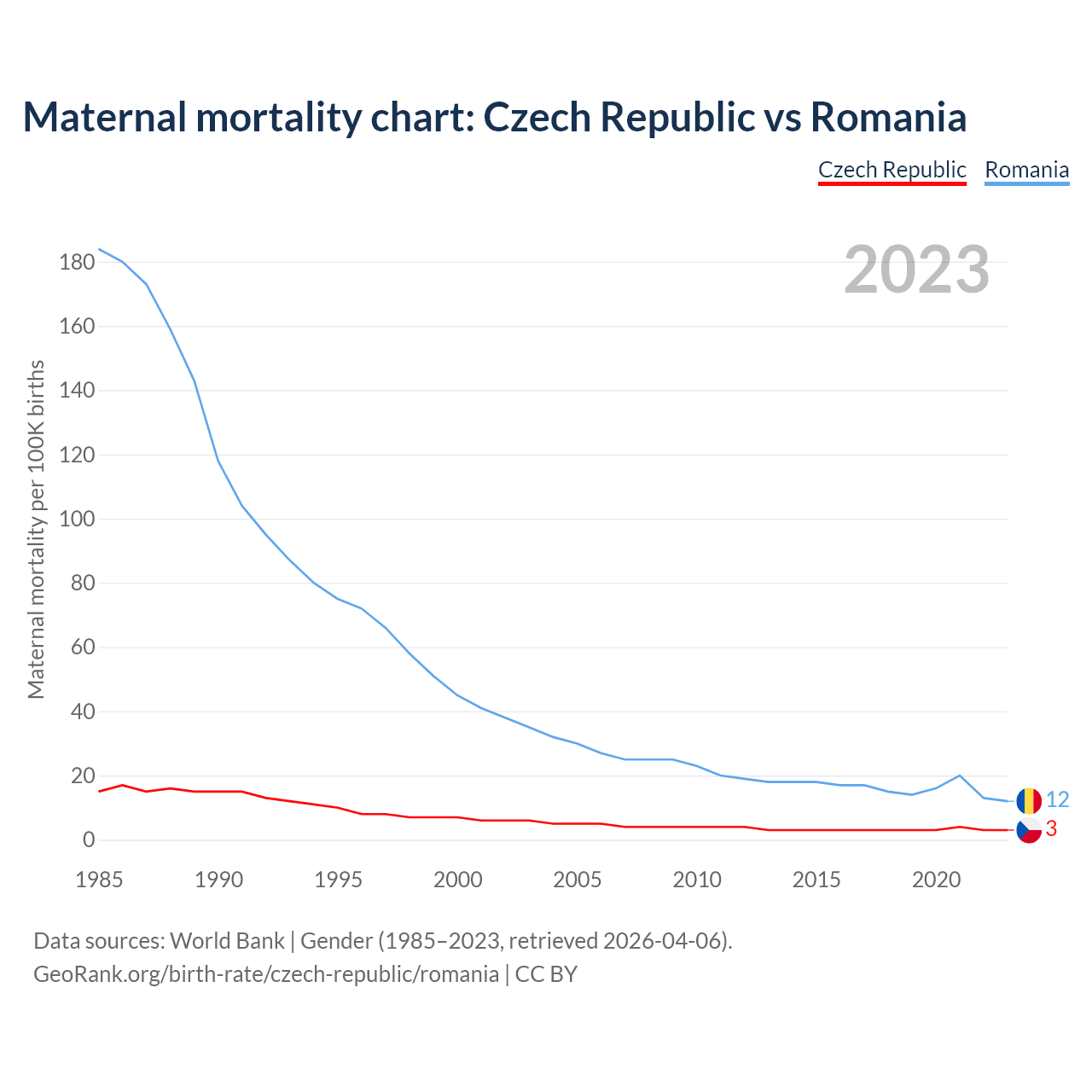 The maternal mortality rate, which is the probability of dying during childbirth or within 42 days of pregnancy termination, is 3 deaths per 100,000 live births in the Czech Republic, compared to 12 deaths in Romania.