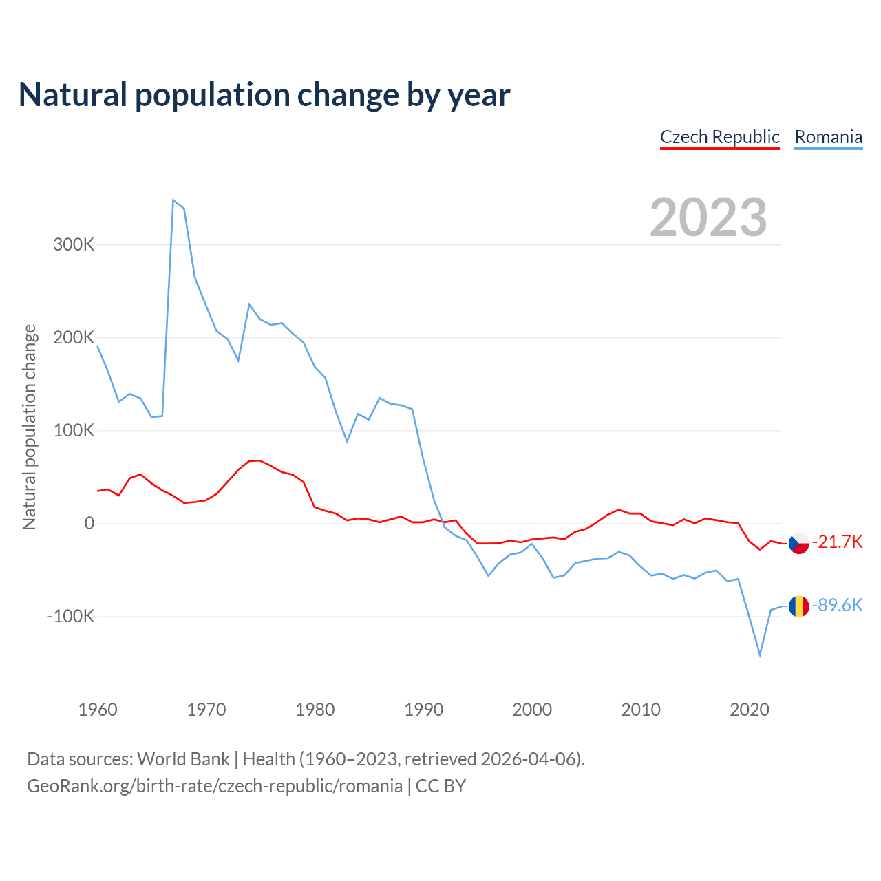 1960 vs 2023, the fertility rate has decreased by 30.6% in the Czech Republic and by 26.9% in Romania — in 1960, it was 2.09 and 2.34, respectively.
