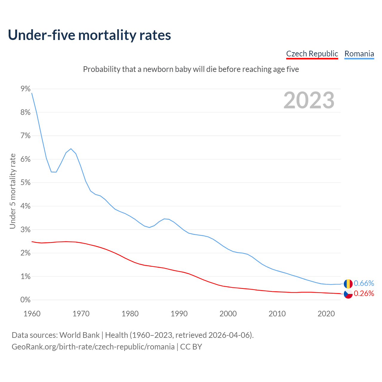The chance that a newborn baby will die before reaching age five is 0.26% in the Czech Republic and 0.66% in Romania. Above is a chart with historical data on under-five mortality rates.