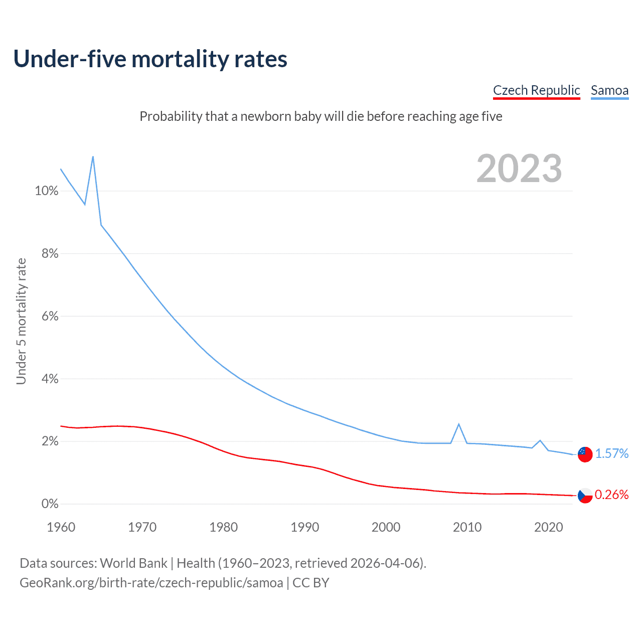 The chance that a newborn baby will die before reaching age five is 0.26% in the Czech Republic and 1.57% in Samoa. Above is a chart with historical data on under-five mortality rates.