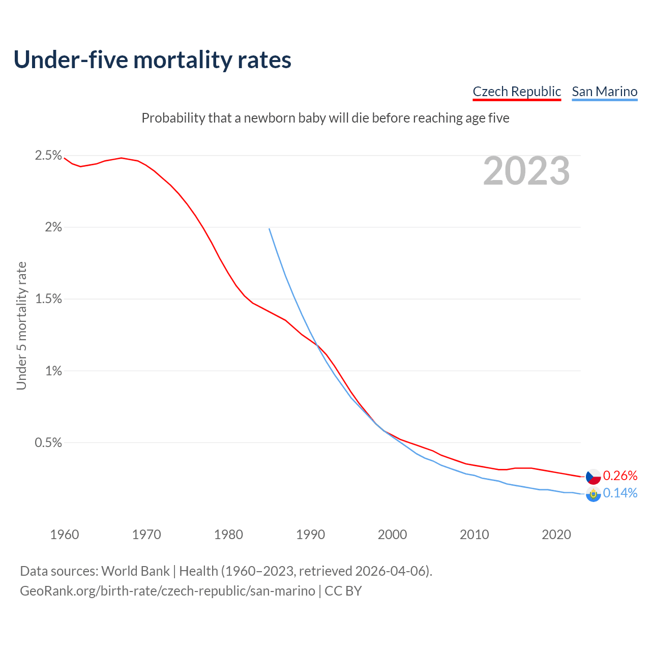 The chance that a newborn baby will die before reaching age five is 0.26% in the Czech Republic and 0.14% in San Marino. Above is a chart with historical data on under-five mortality rates.