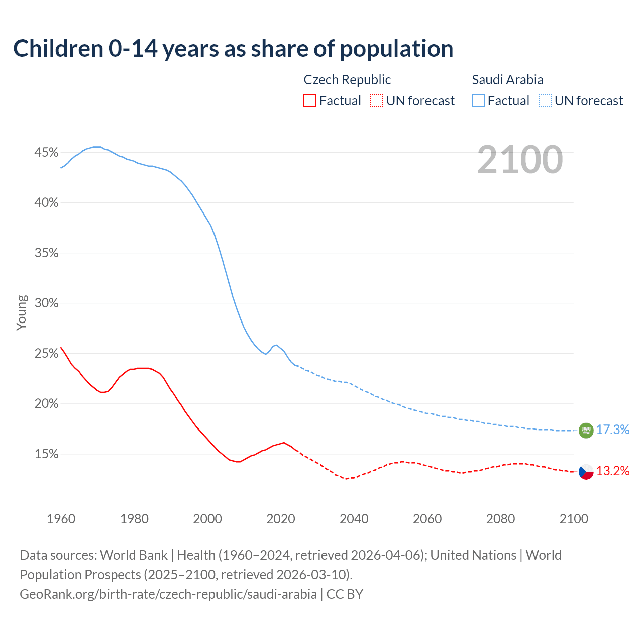 According to the latest available data on birth rates, the fertility rate in the Czech Republic was 1.45 children per woman in 2023, compared to 2.28 in Saudi Arabia in 2023. The replacement level is considered to be 2.1 children per woman.