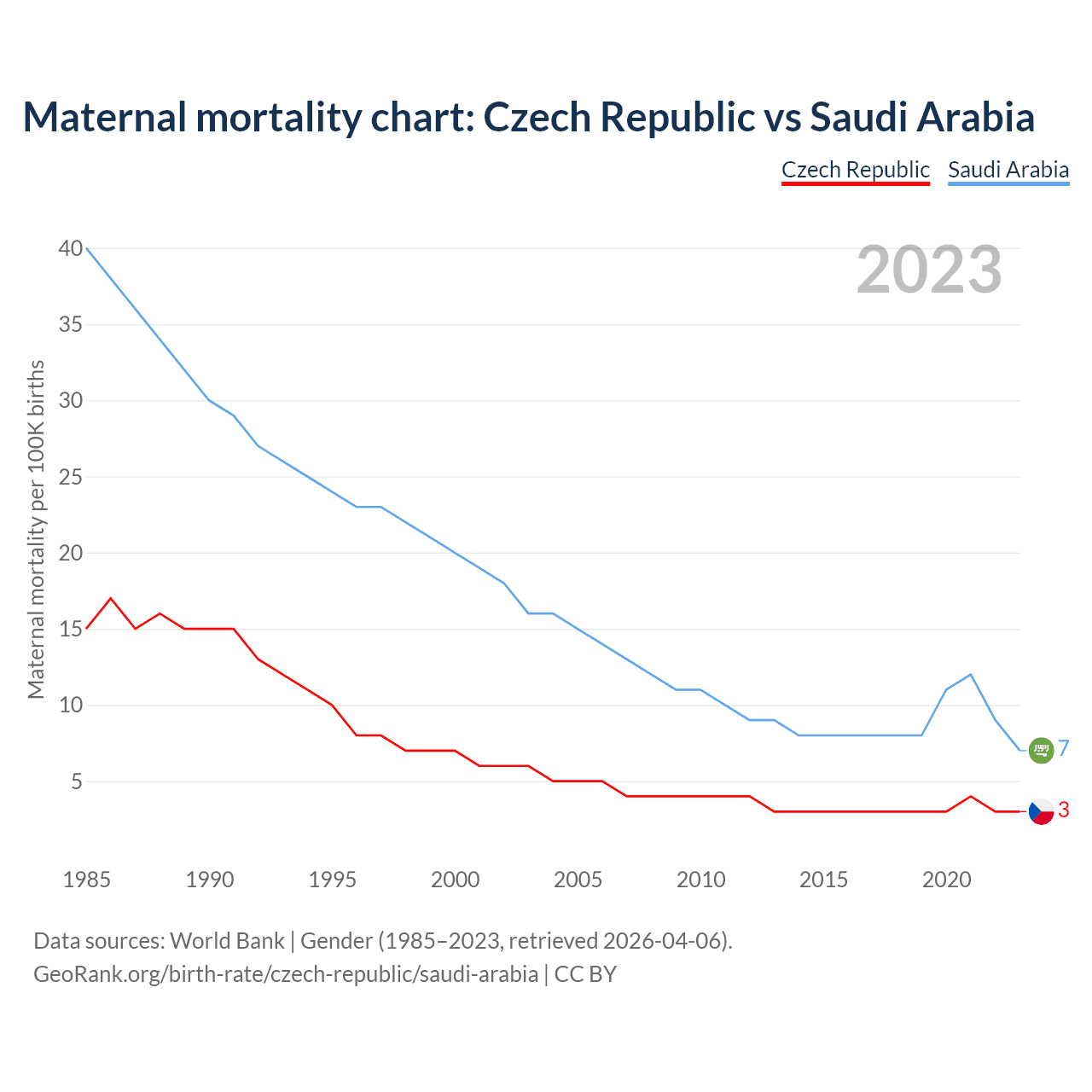 The maternal mortality rate, which is the probability of dying during childbirth or within 42 days of pregnancy termination, is 3 deaths per 100,000 live births in the Czech Republic, compared to 7 deaths in Saudi Arabia.