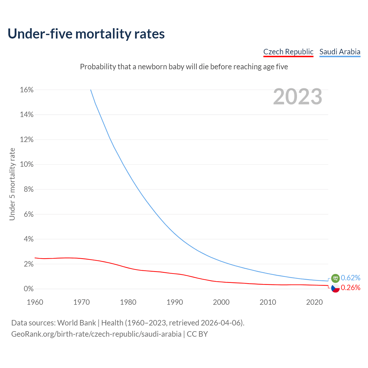 The chance that a newborn baby will die before reaching age five is 0.26% in the Czech Republic and 0.62% in Saudi Arabia. Above is a chart with historical data on under-five mortality rates.